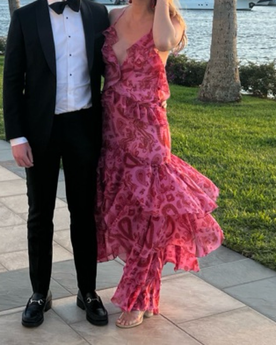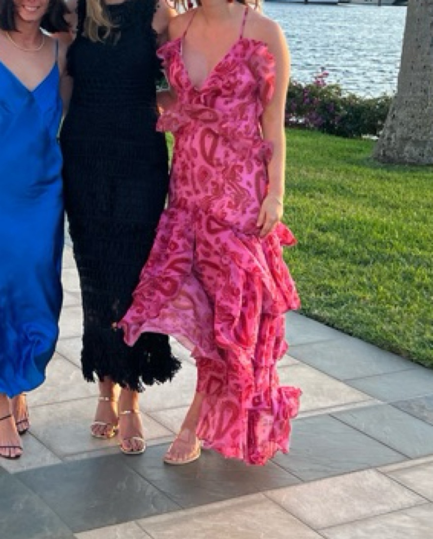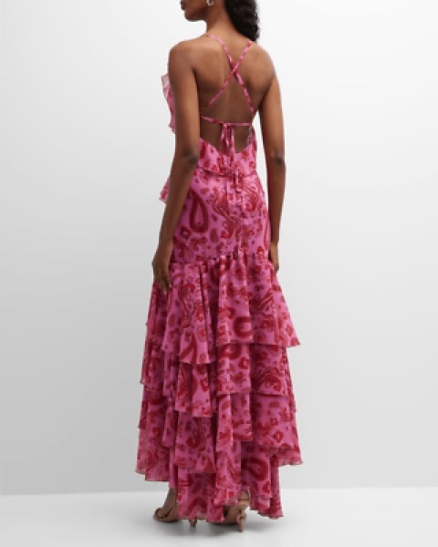 Ruffle paisley print high / low dress. Perfect for summer black tie weddings. LACE the Label brand from Neiman Marcus