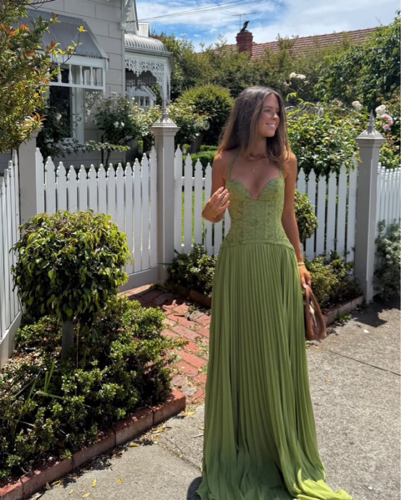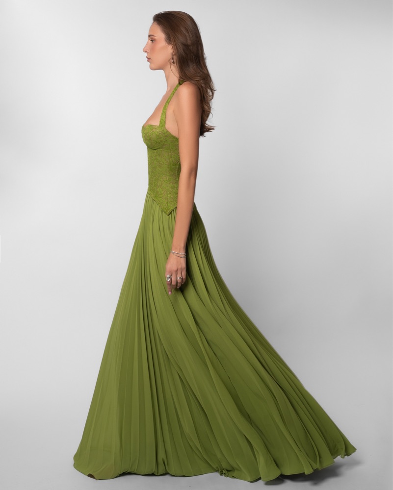 The Gaia Dress comes in a rich green tone, featuring our signature floral lace on the top part with boning and a snatching corset. The pleated skirt drapes effortlessly, moving with a soft, graceful flow. Guaranteed to be the most unique dress in the room, made to steal the spotlight.