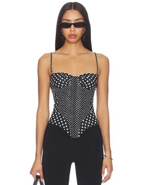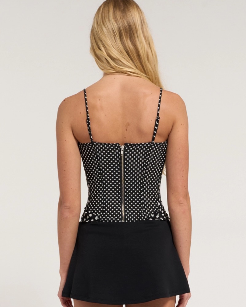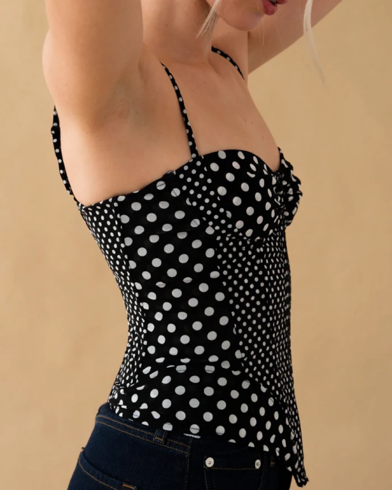 This polka dot cami is perfect for a night out with friends or a fun summer date. The fitted silhouette and flattering ruching detail create a flirty and feminine look.