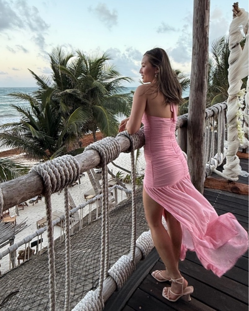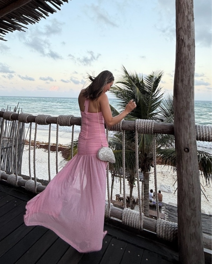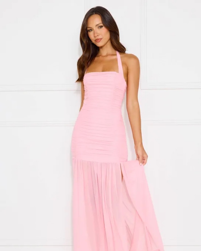 pretty pink halter maxi dress with semi sheer skirt!