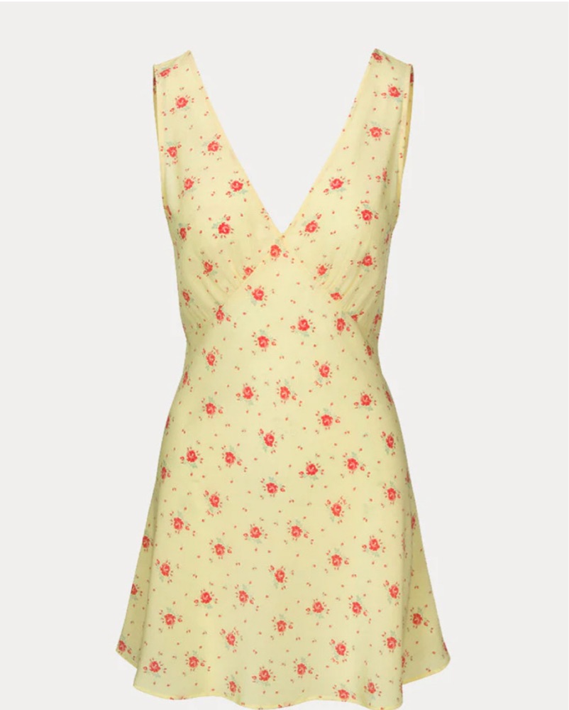 Pale yellow floral sleeveless mini dress •v-neck •adjustable waist tie •A-line shaped