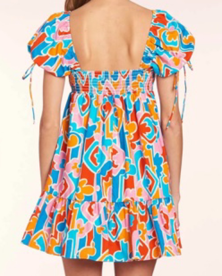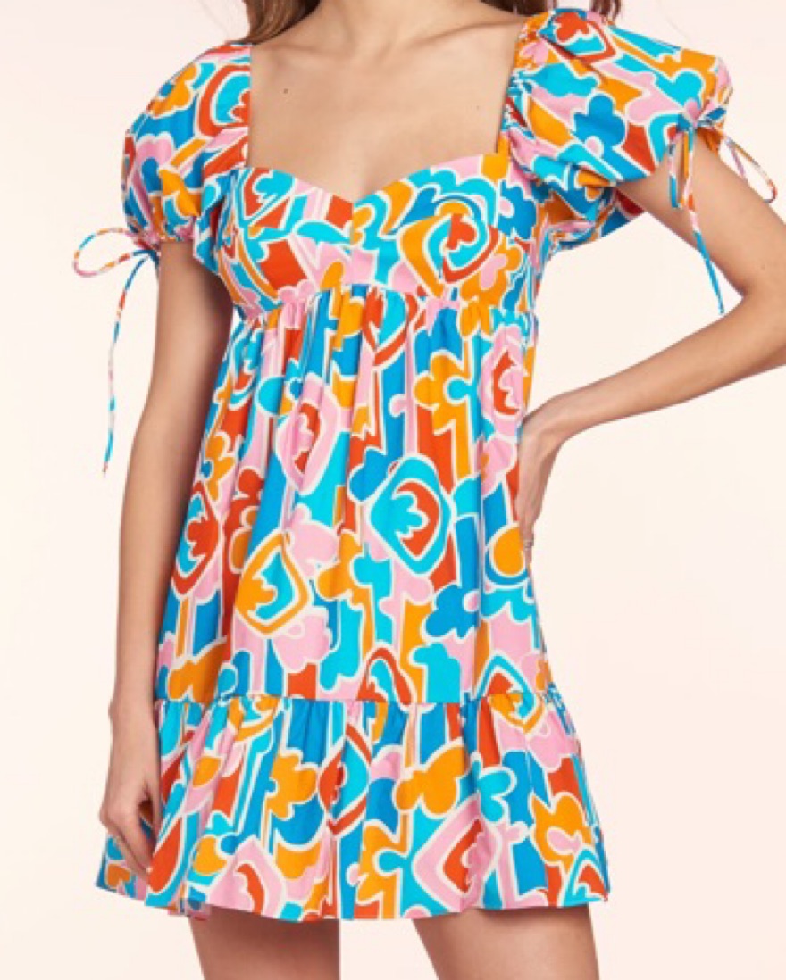 Single tier mini dress with sweetheart neckline and puff sleeves with tie details. This day-to-evenign dress is the perfect option for Saturday brunch, trip out East, or into the office. This dress has a center back zipper.