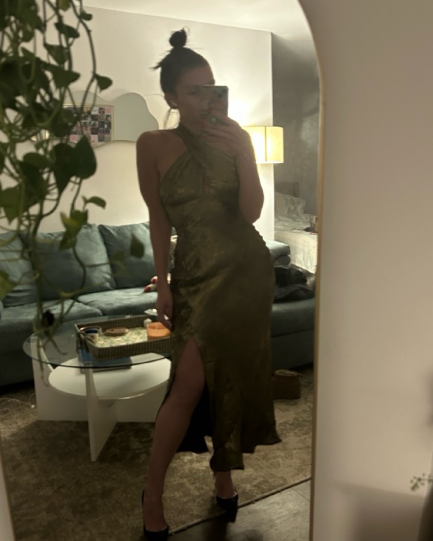 ** runs big - xs closer to a s*** Elevate your evening look in this captivating gold dress. The halter neckline and high slit create a glamorous, sophisticated silhouette perfect for any special occasion.