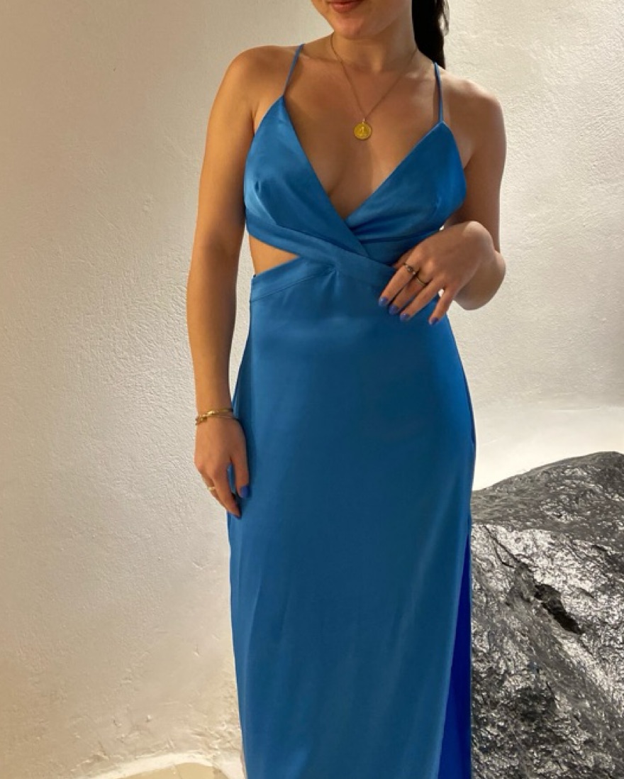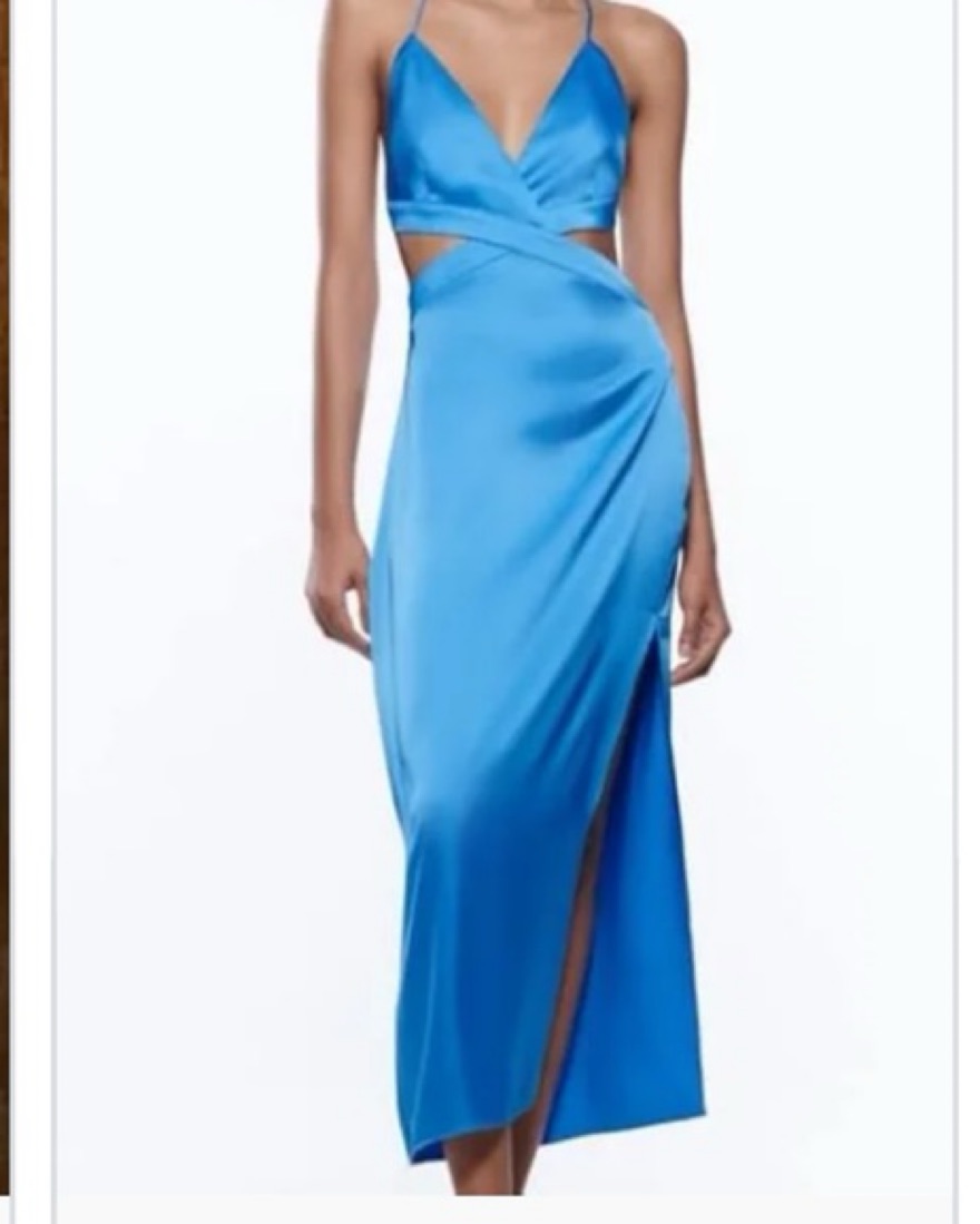 Flattering satin long blue dress with leg slit. It goes until my ankles and I’m 5’1. Perfect for a summer event!