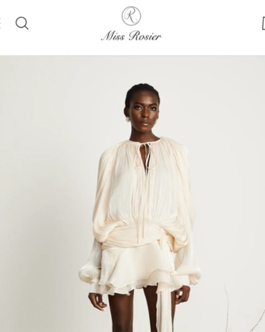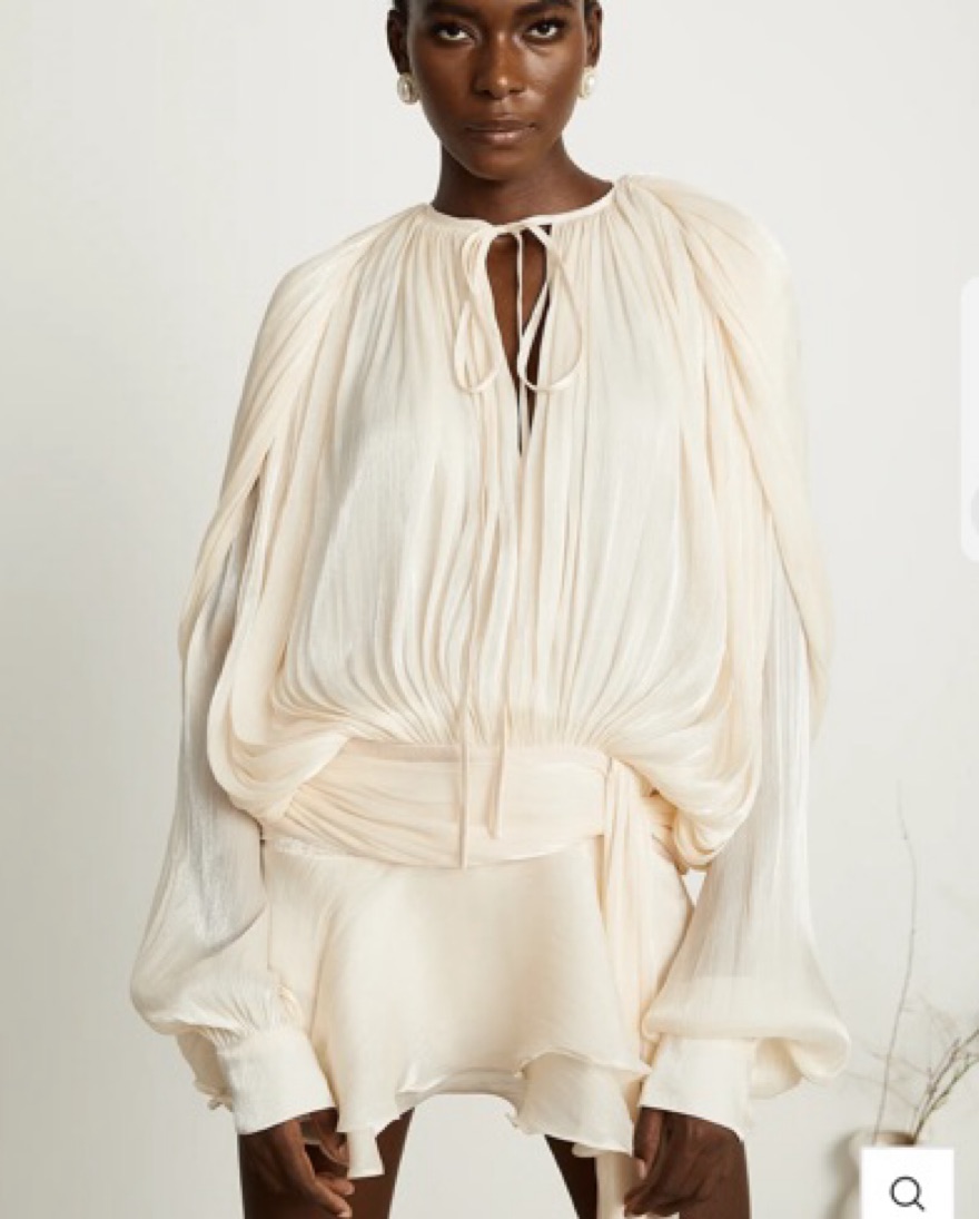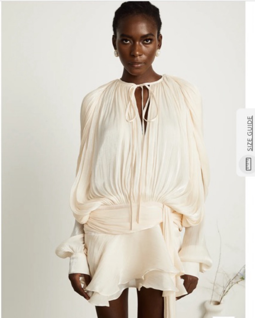 EUGÉNIE FULLY-PLEATED RUFFLED MINI DRESS IN NEUTRALS. Long buttoned-cuff sleeves • Neck tie fastening • Twist design • Draped design • Fully pleated • Ruffled hem • Glitter detailing • Ruffled hem • Semi-sheer construction • Mini length • Rear button fastening