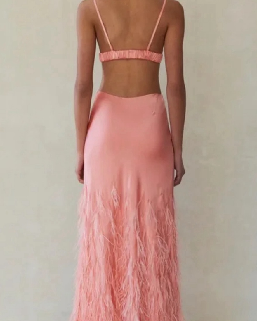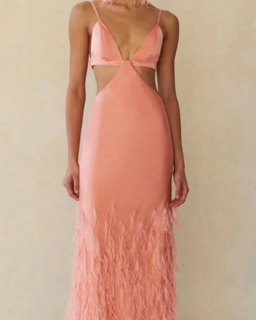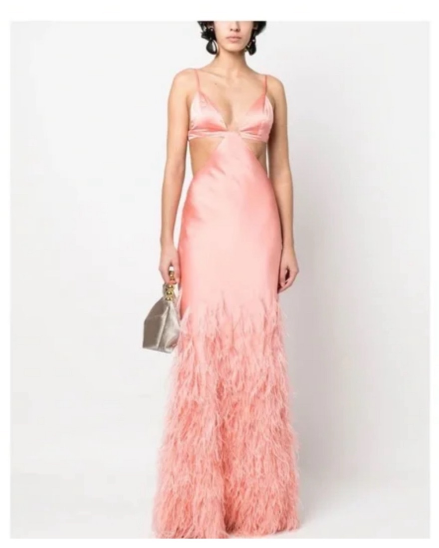 Featuring pink/peach, silk, satin weave, feather-trim detailing, cut-out detailing, V-neck, rear hook and eye fastening, concealed side zip fastening, spaghetti straps, elasticated strap, flared hem and floor-length. Imported Composition Outer: Feather 100%, Silk 100%