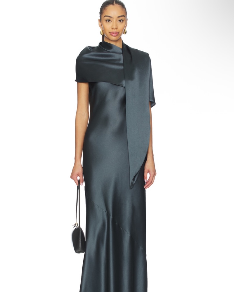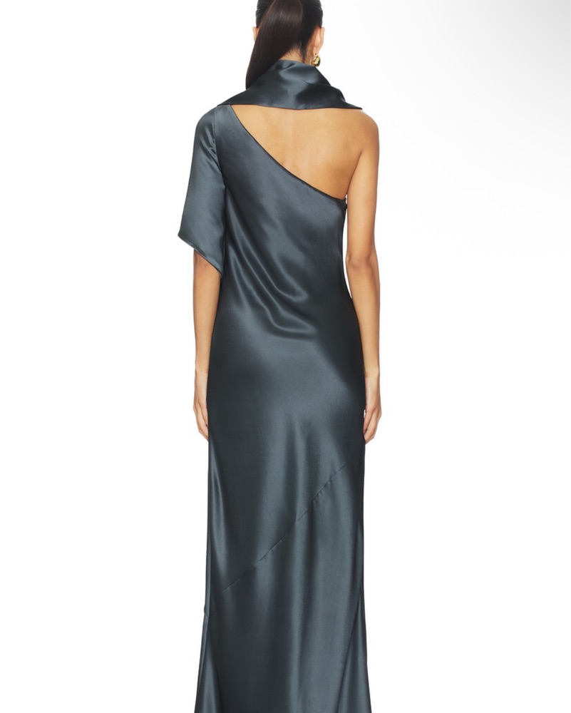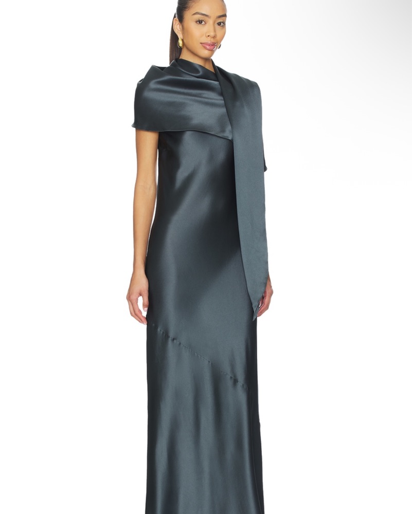 Perfect for weddings or black tie events! Color is granite. Materials: 74% acetate, 26% polyester Midweight satin textile Attached draped sash design