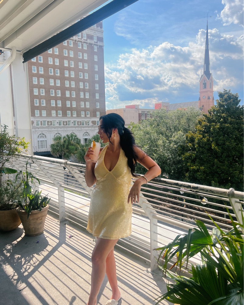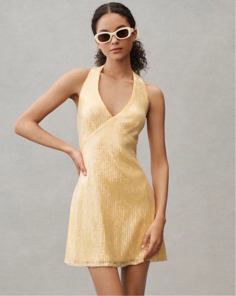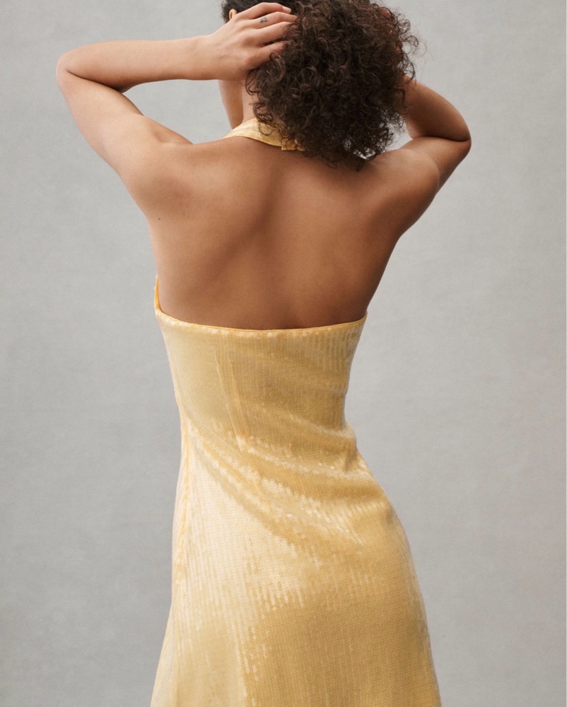 This eye-catching yellow sequin dress is perfect for a night out on the town, date night, or tropical vacation. The halter neckline and body-hugging silhouette create a show-stopping look.