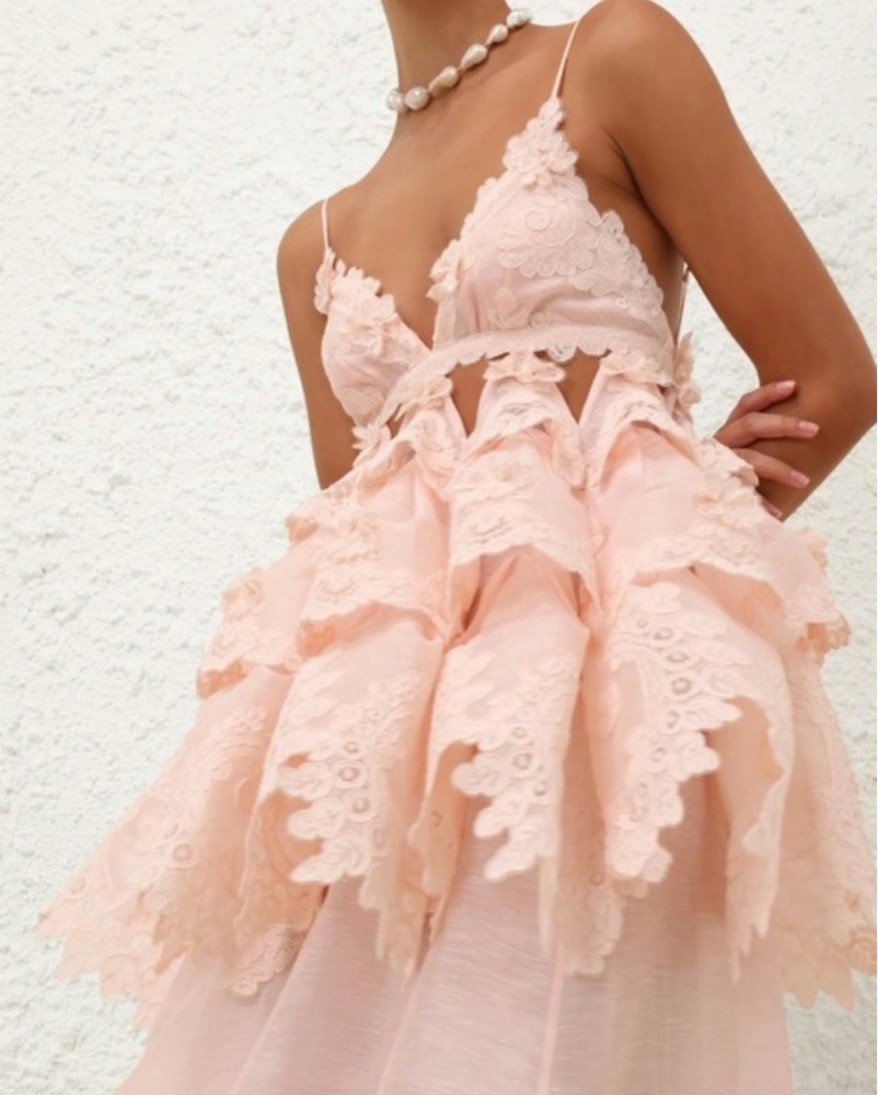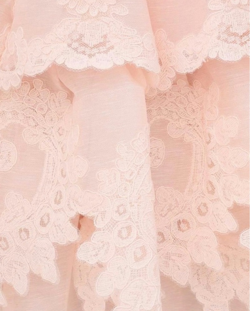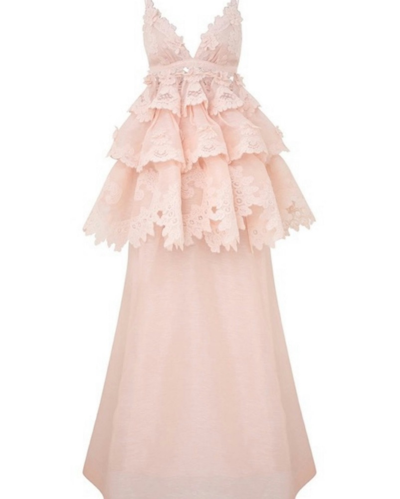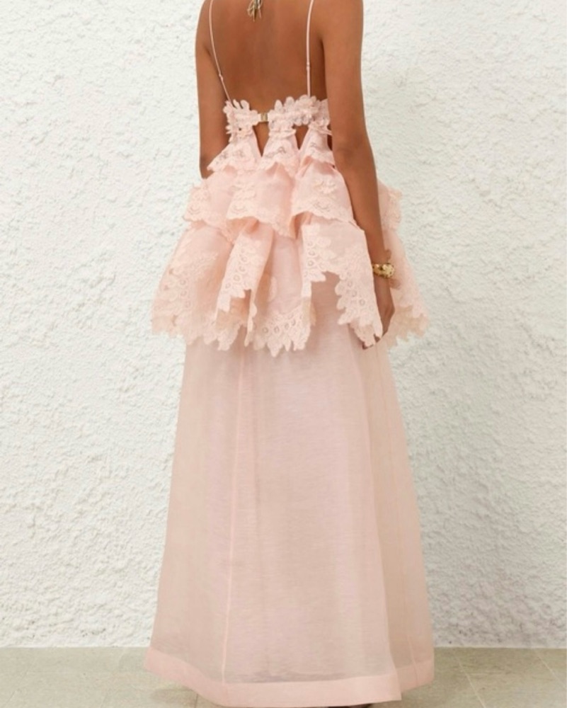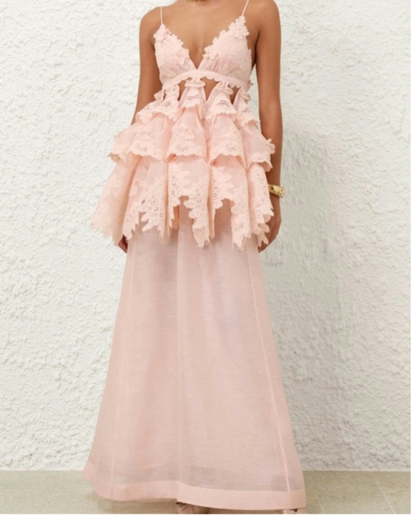 The Crush Tiered Lace Maxi Dress in Pale Pink from the Resort 2025 Collection, Crush. A silk linen tiered maxi dress featuring a plunging V-neckline with cutouts under bust, an elastic strap at the centre back with a clasp and lace trim appliques throughout.