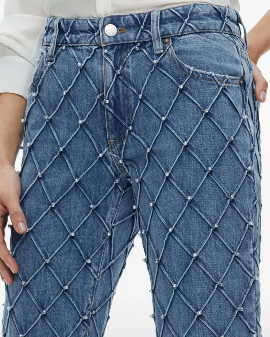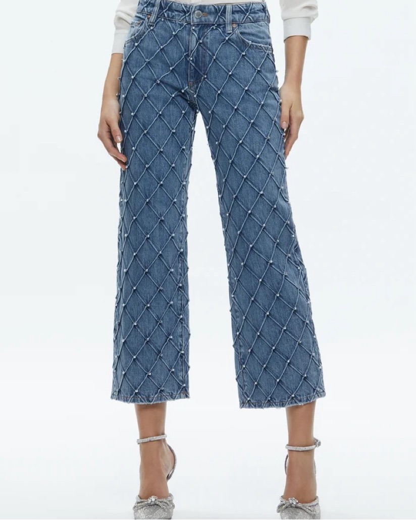 Weezy quilted and rhinestone/pearl embellished jeans from Alice + Olivia. Great for nights out, date nights, and girls nights!