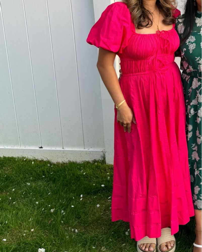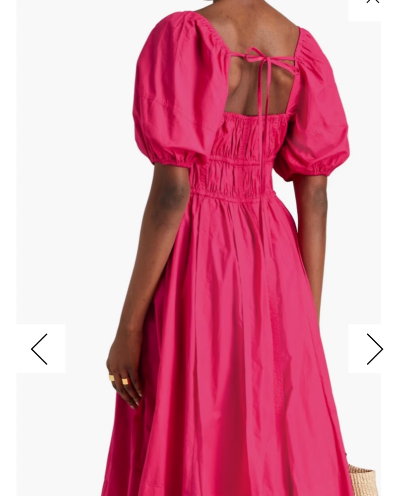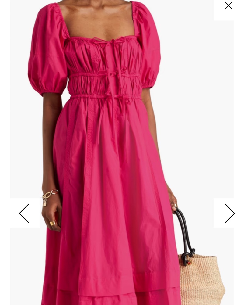 This stunning sundress by Ulla Johnson is perfect for a wedding guest or cocktail event. It features a backless design with a tie front, adding a touch of elegance to its scoop neckline. The puff sleeves and vibrant pink color complete the romantic and feminine look.