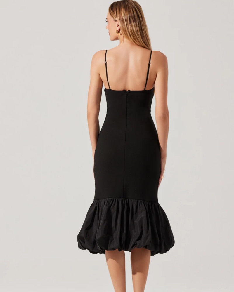 This sleek black bubble dress is perfect for a formal event or special occasion. The fitted silhouette and flared hem create a flattering and sophisticated look.