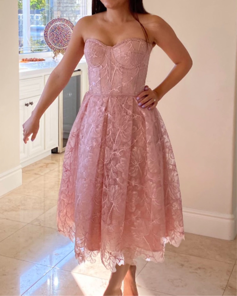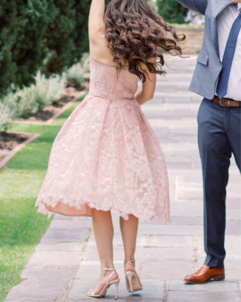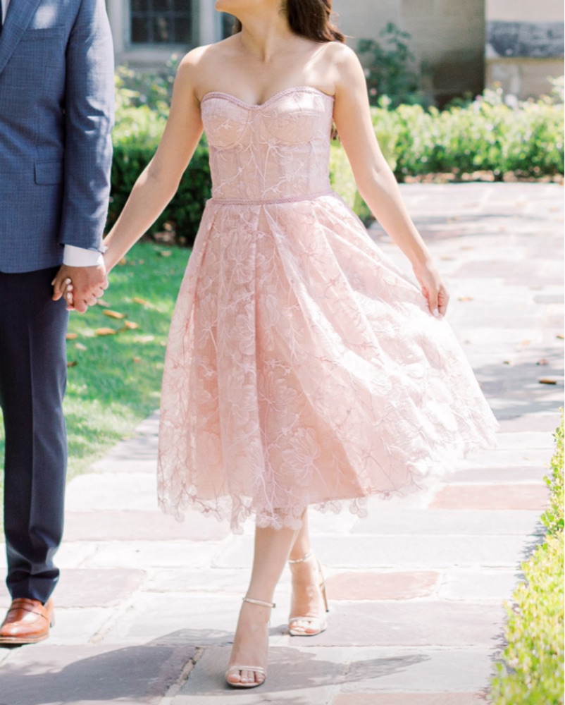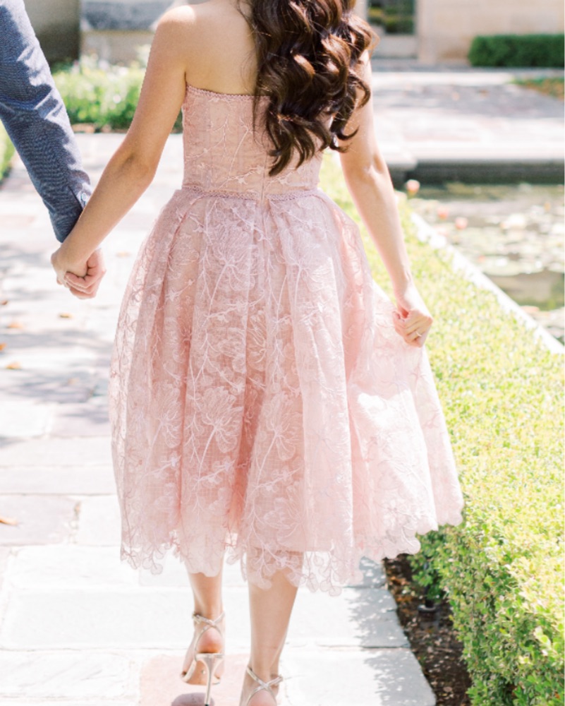 Worn once for 1 hour for my engagement photos! Stunning fabric and details, light pink color.