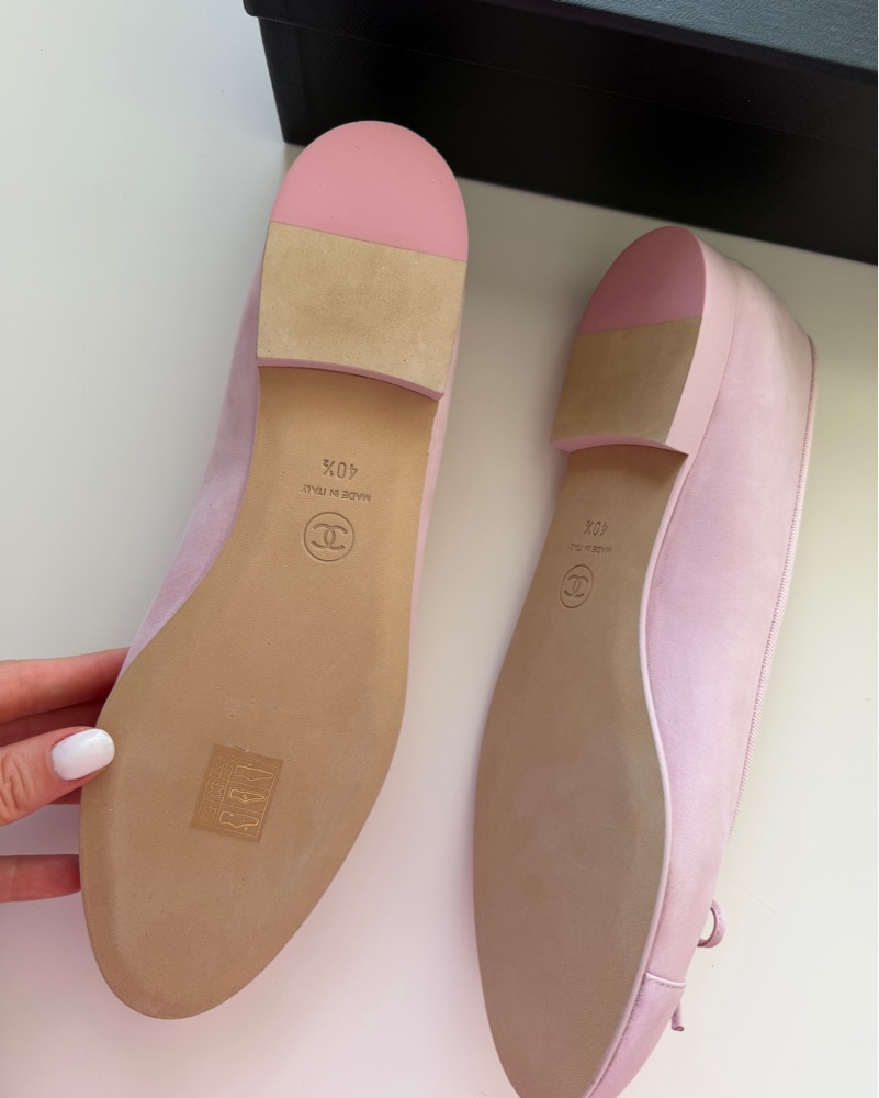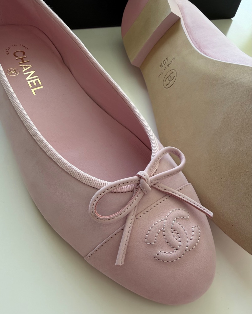 These classic Chanel ballet flats are perfect for elevated casual wear or a chic daytime look. The soft leather construction and signature Chanel embellishment make them a timeless wardrobe staple.