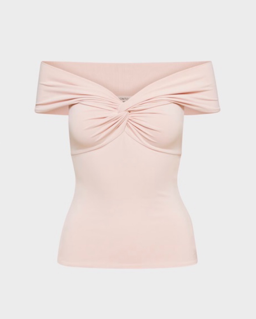 Off-the-shoulder top with a twist front and double-layer fabric for a supportive and flattering fit. No bra needed! Color: Bow Pink