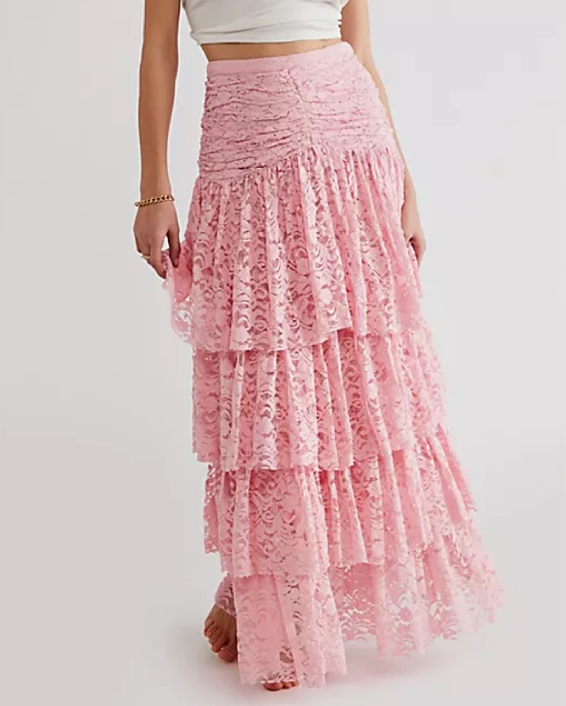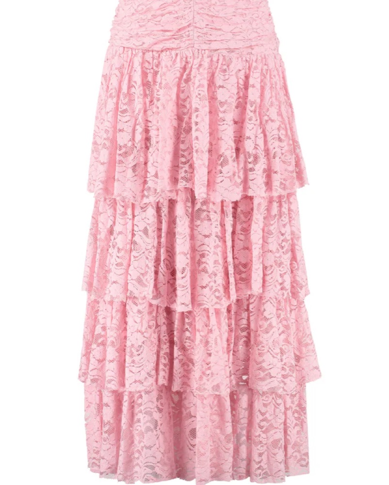 LoveShackFancy Masala Pink Lace Tiered Ruffle Maxi Skirt. Stunning statement piece that can be dressed down with sneakers + basic tank / tee, or dressed up with my pink feather Cult Gaia top! Size 8, but can comfortably fit size 6.
