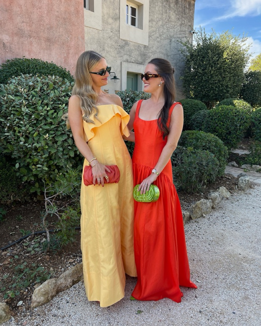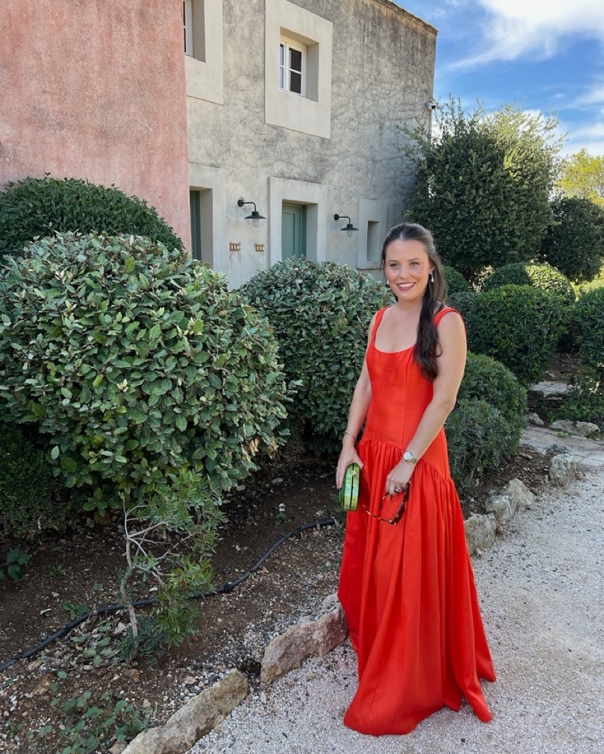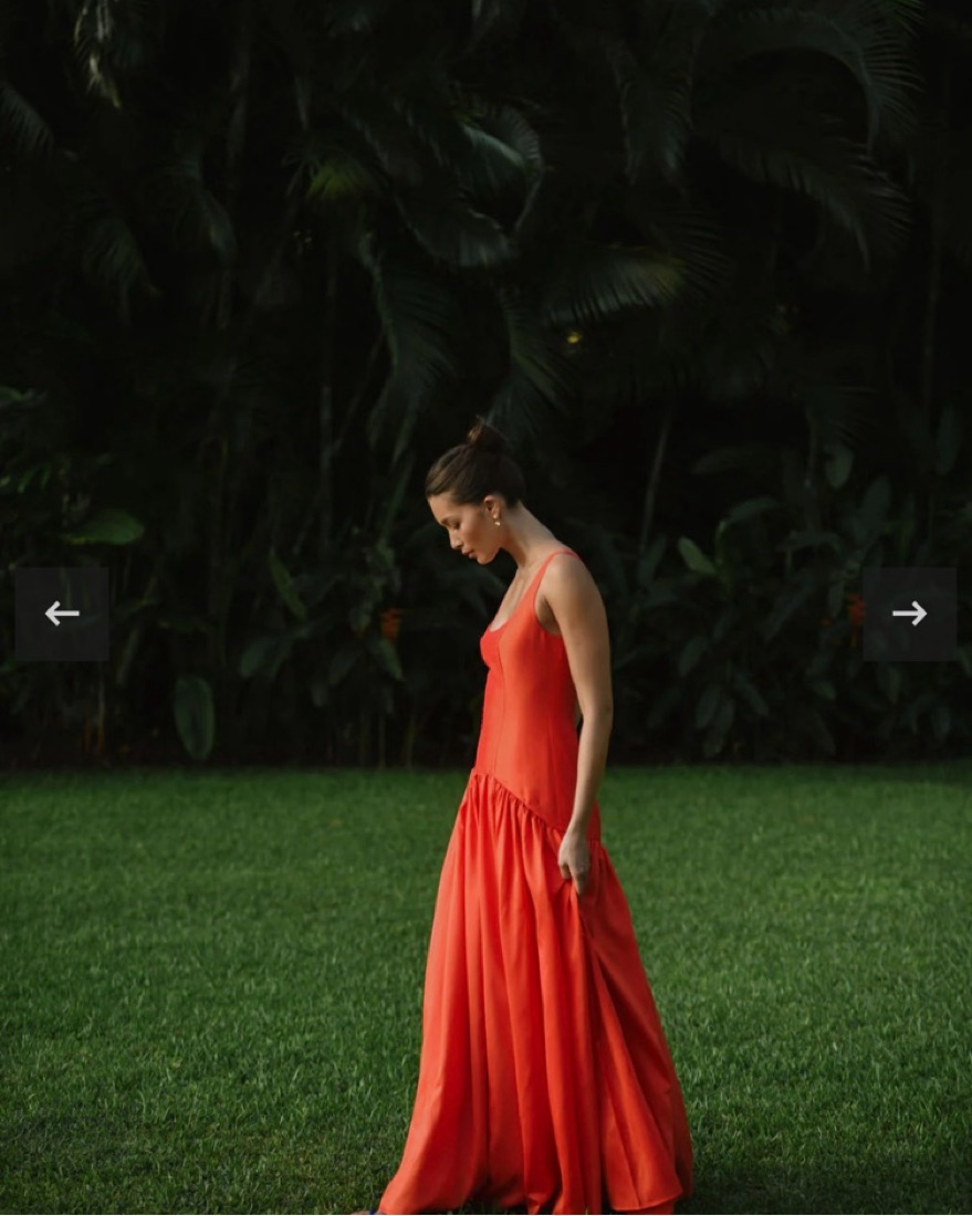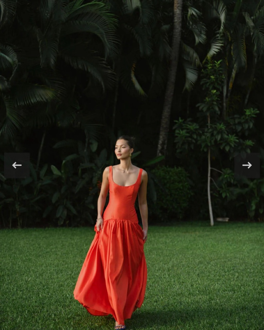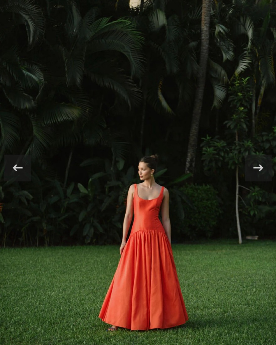 Tangerine color drop waist dress - reddish orange. Note - tag size is 4! I typically wear a 2 but when ordered only a 4 was left so I had the bodice altered in. Did not alter the length and it is a bit long on me w 1 inch heels. It is still a little big on me in the chest/straps!