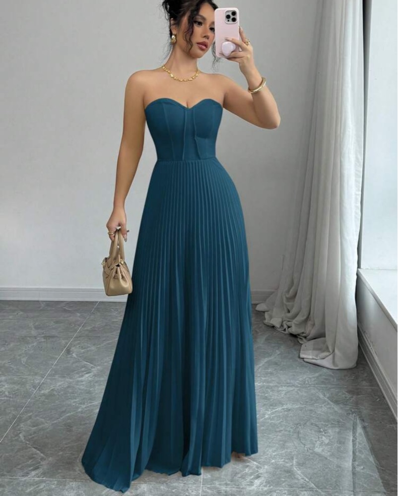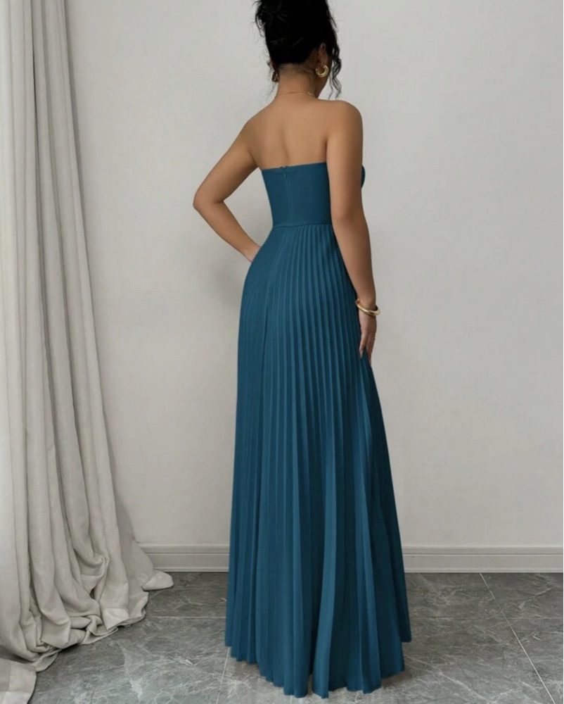 This elegant teal gown features a strapless sweetheart neckline and a pleated skirt that cascades gracefully. It's perfect for a formal event or black-tie affair.