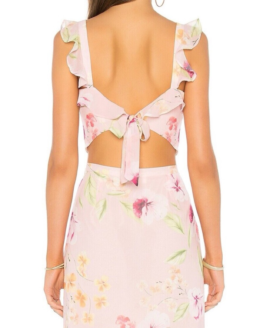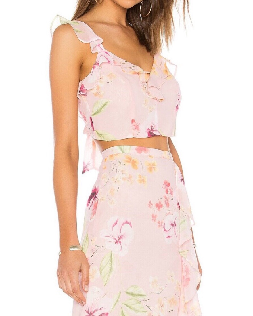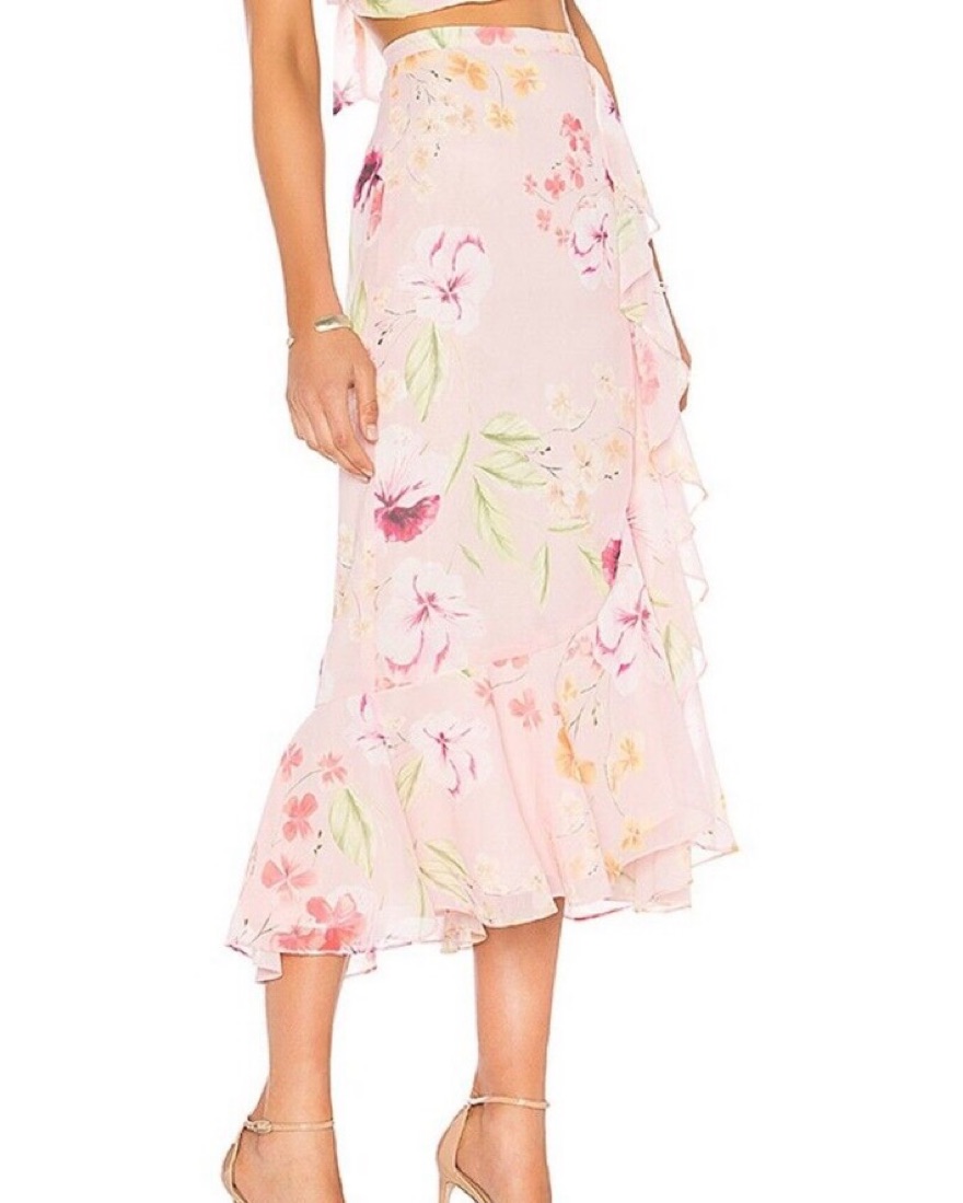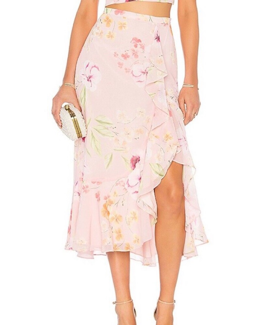 TOP: XS BOTTOM: S — This delicate floral print set is perfect for a summer wedding or garden party. The ruffled crop top and flowing skirt create a feminine, eye-catching look.