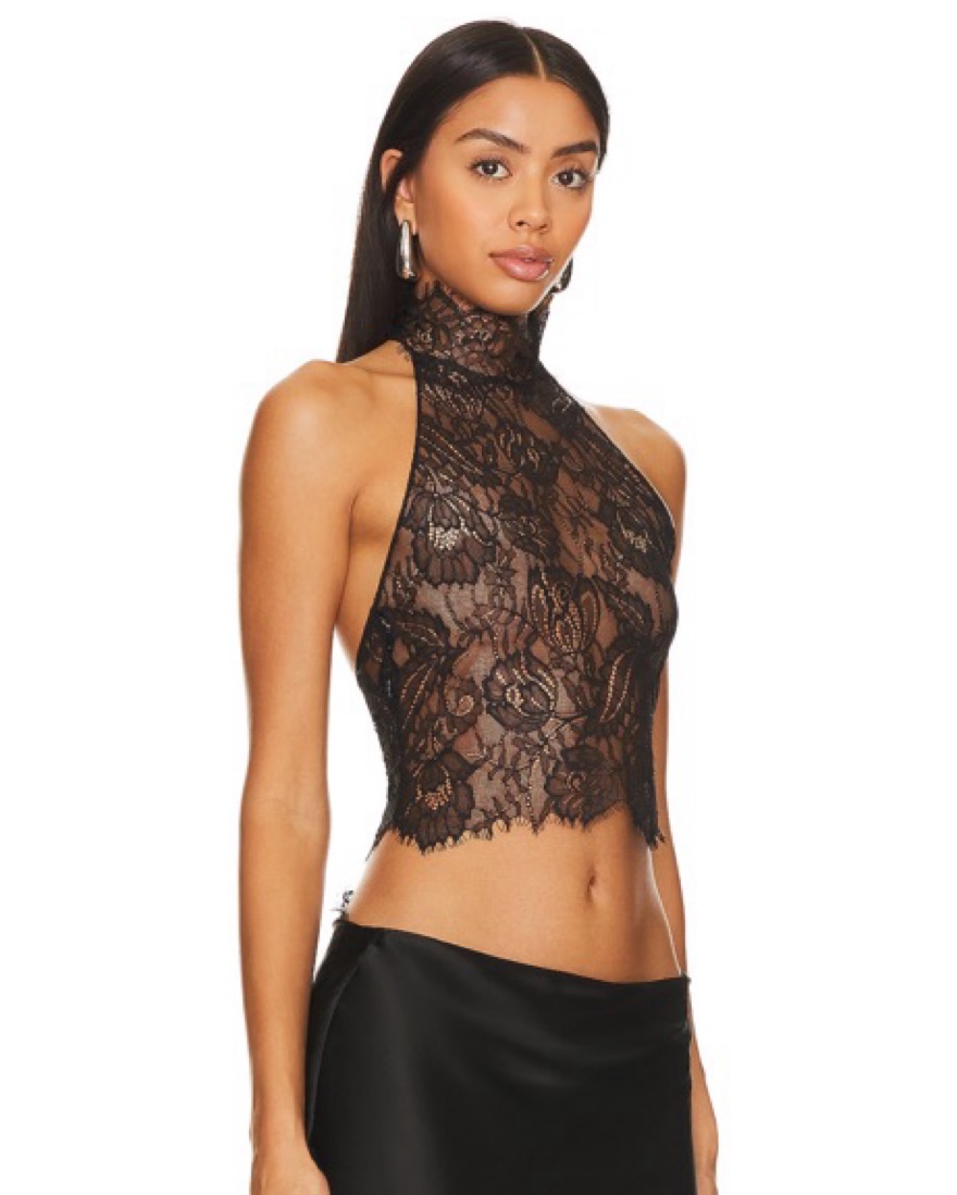 Halterneck styling with back loop button closure Delicate sheer lace fabric Garment is intentionally sheer, undergarments will show through.