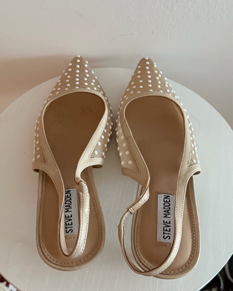 Elevate any outfit with these chic polka dot slingback heels. Perfect for a sophisticated evening look or dressed-up daytime ensemble. Steve madden kitten heels.