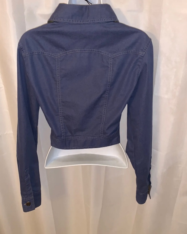 CHANEL light weight blue cotton blend cropped denim jacket, signature five button front closure, single button closure at sleeve, kidglove leather accent at interior of collar.NEAR MINT, no visible signs of prior wear except one side of CHANEL tag has loose threads.. From Fall/Winter 2001 C