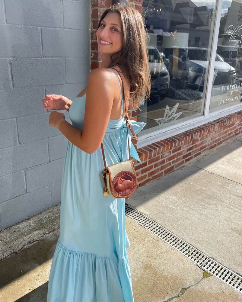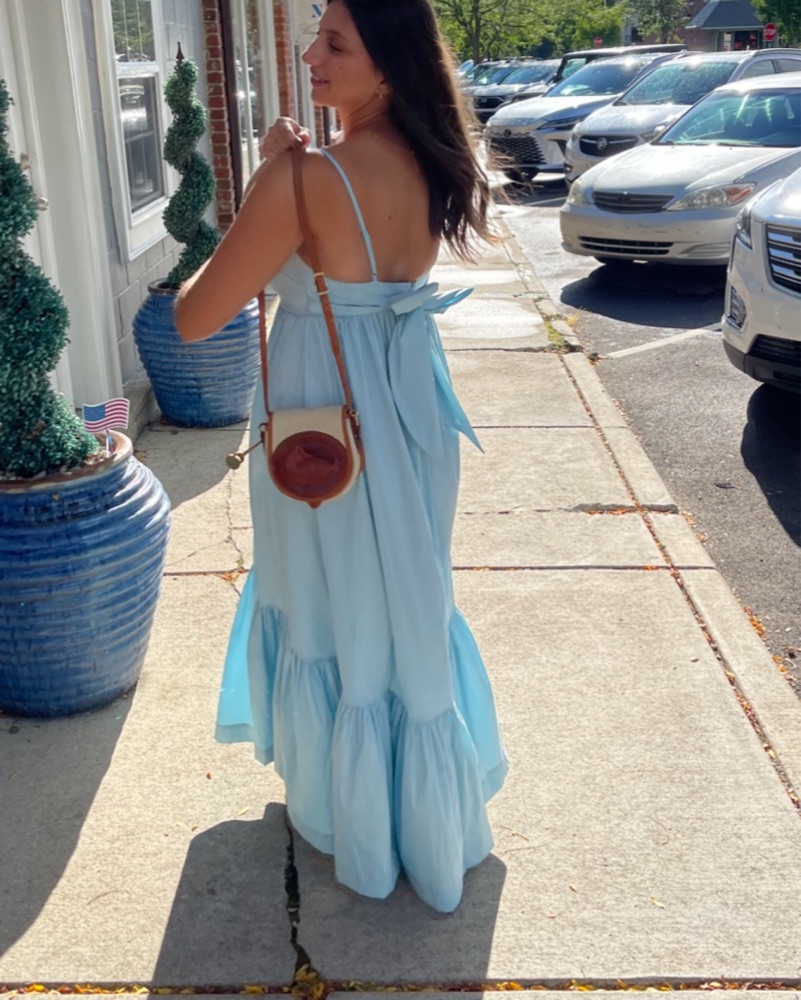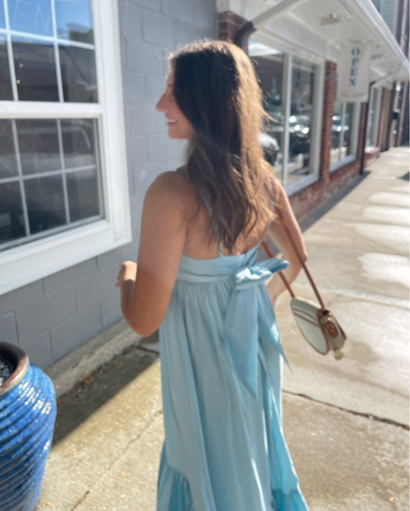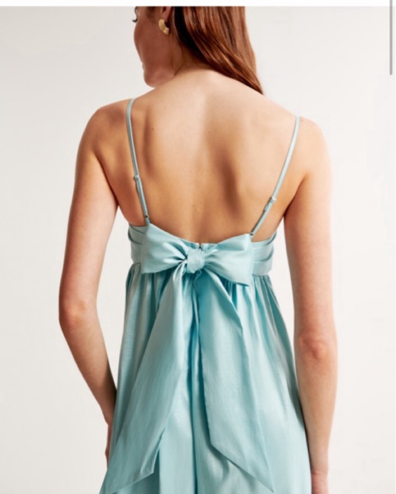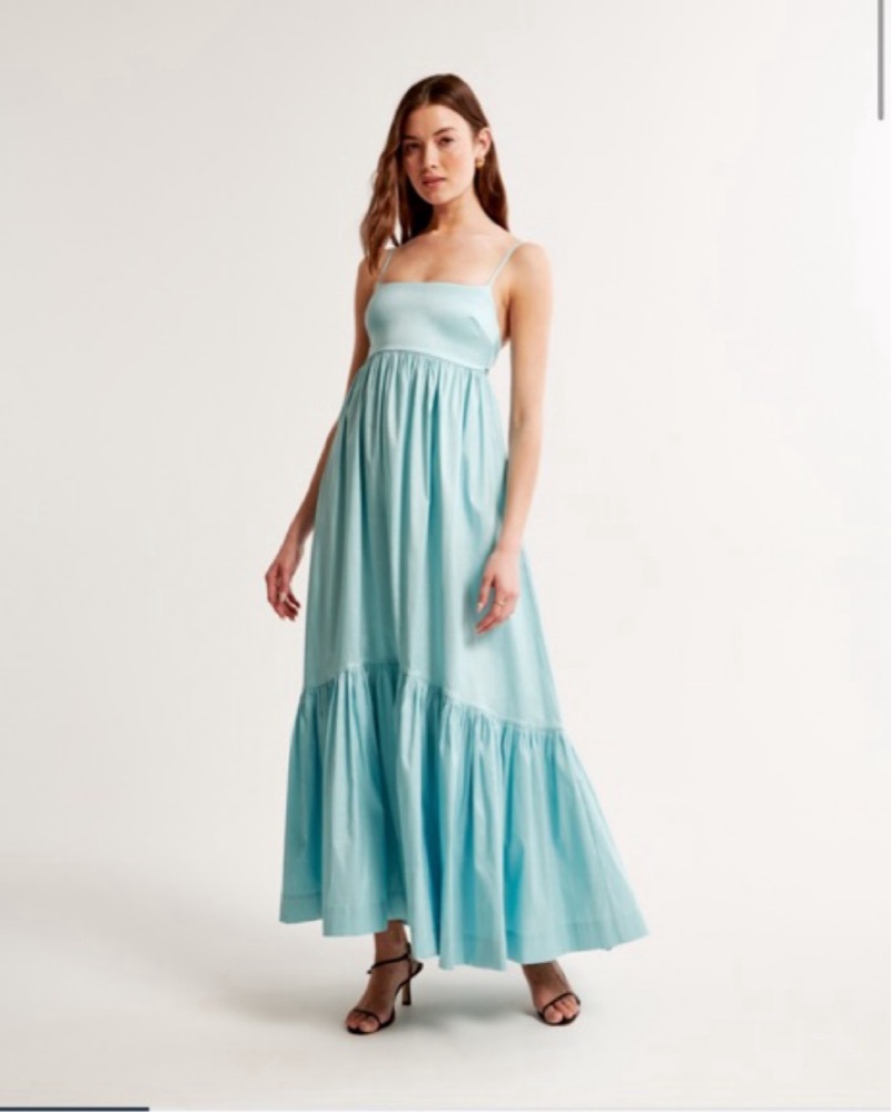 Blue Abercrombie bow tie back dress. I am 5’4” and dress hit at a long midi/maxi length on me! Fabric is amazing and thick. So flattering and beautiful! I got complimented a ton when I wore!