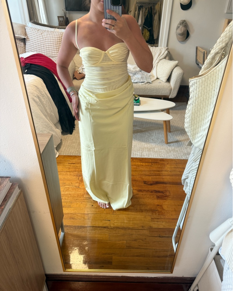 Butter yellow with gathered detail. Fits more like a size s/m and sits better on someone with less hips!