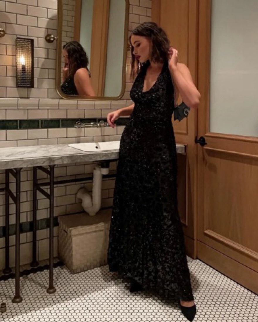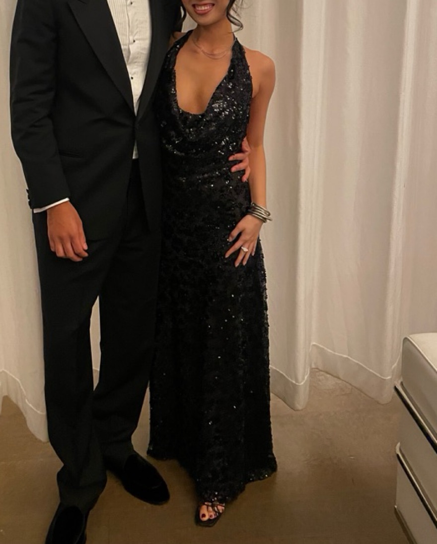 Black sequined gown with open back. Plunge neck with exposed chest - you can adjust how deep the neck goes with the halter closure. Perfect for a NYE Wedding
