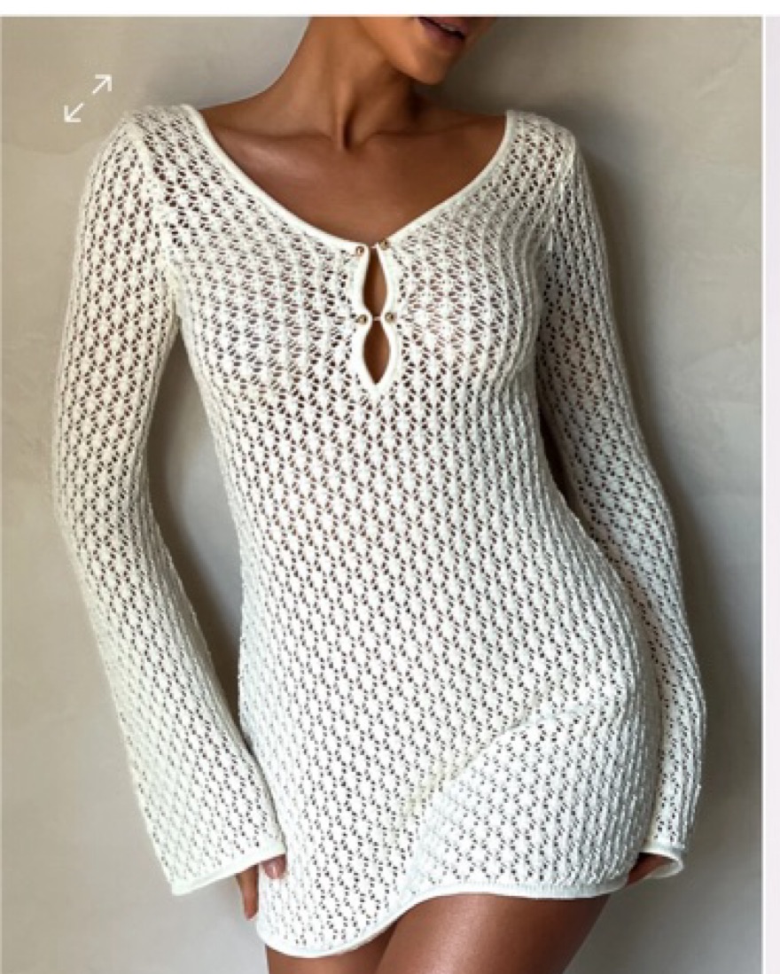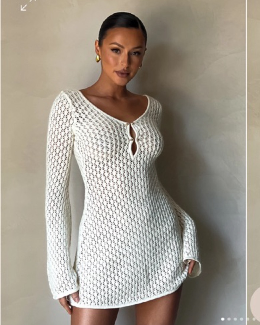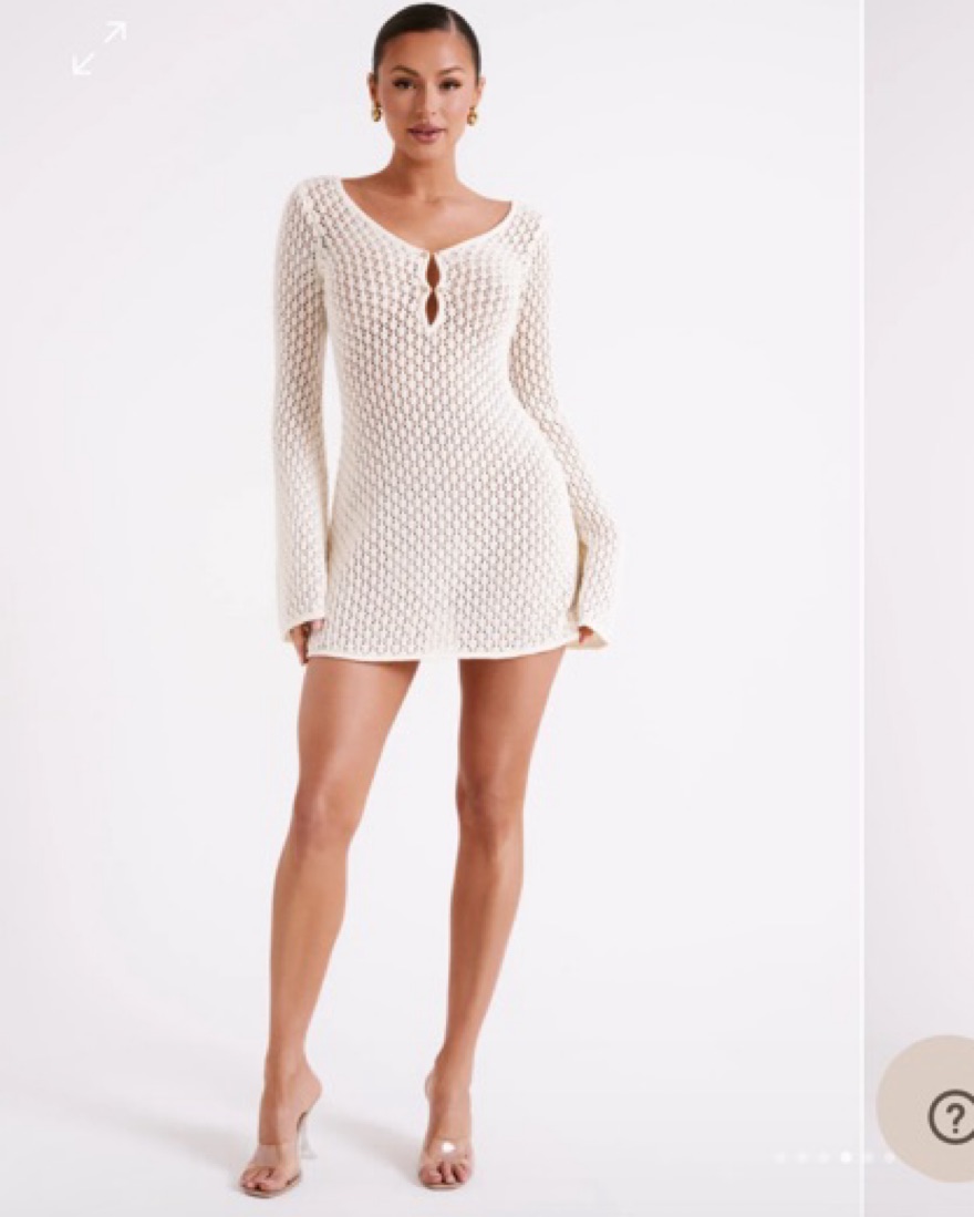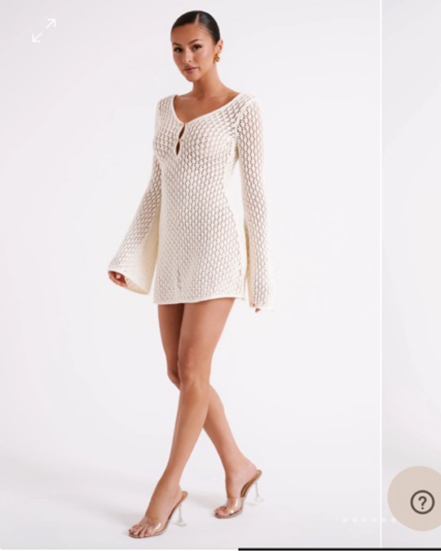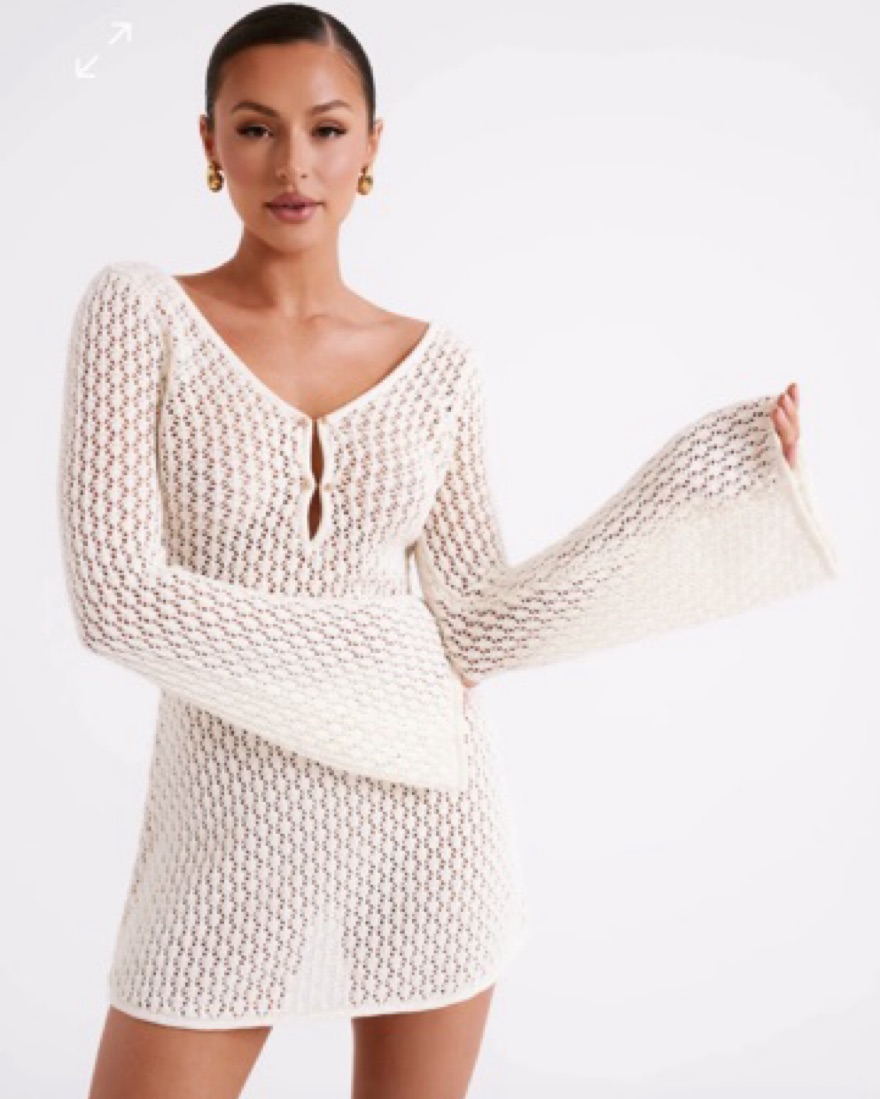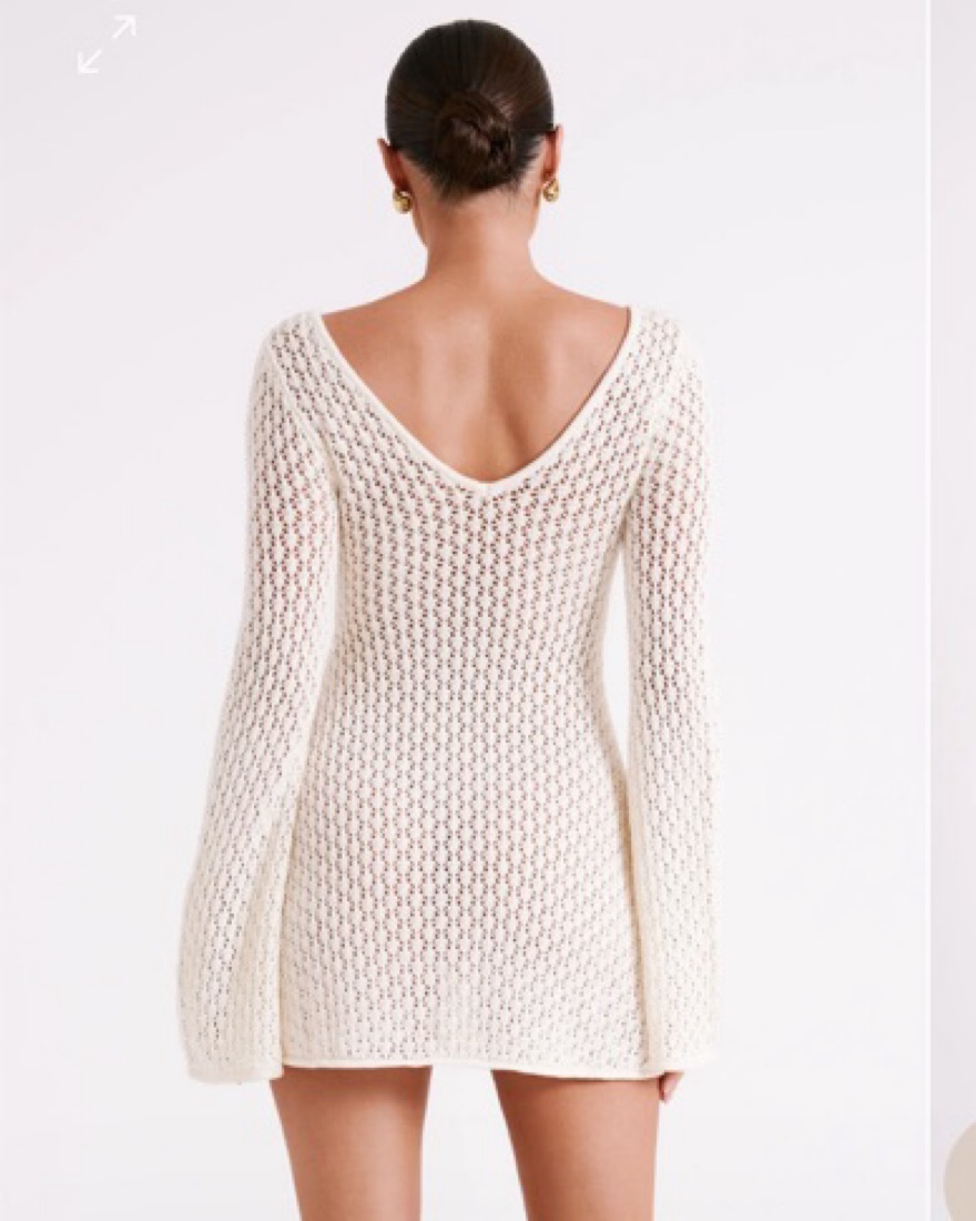 The KAYLEIGH is a knit mini dress, designed in a vintage-inspired crochet fabrication. Crafted with long bell sleeves and balanced with a mid-low back, it’s a piece made for easy styling during the day and dressing up with heels in the evening.
