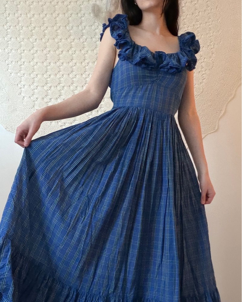 Doen x Net Sustain Plaid Print Crochet & Ruffle Accents Short Sleeve with Square Neckline Sash-Tie Closure at Back, in amazing condition