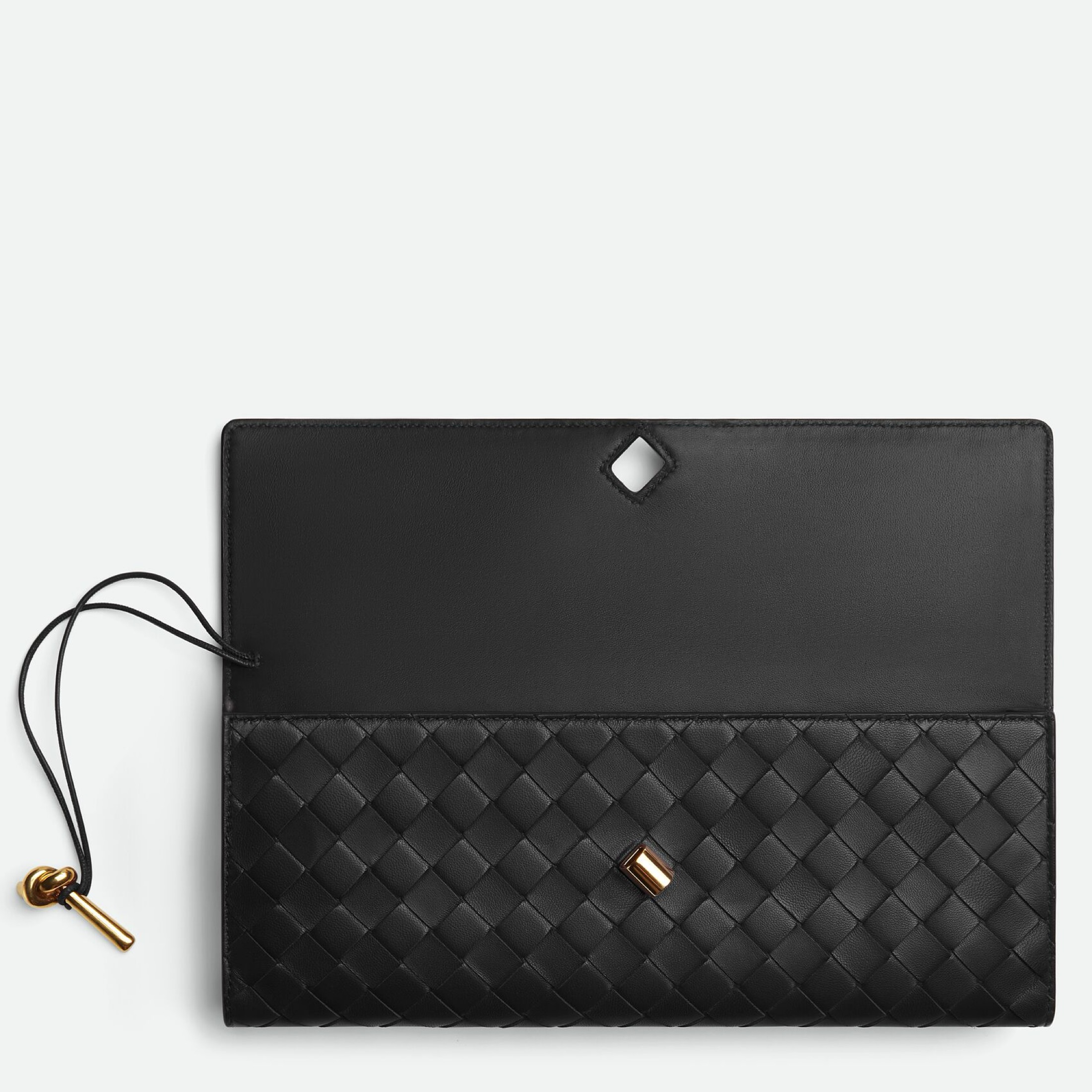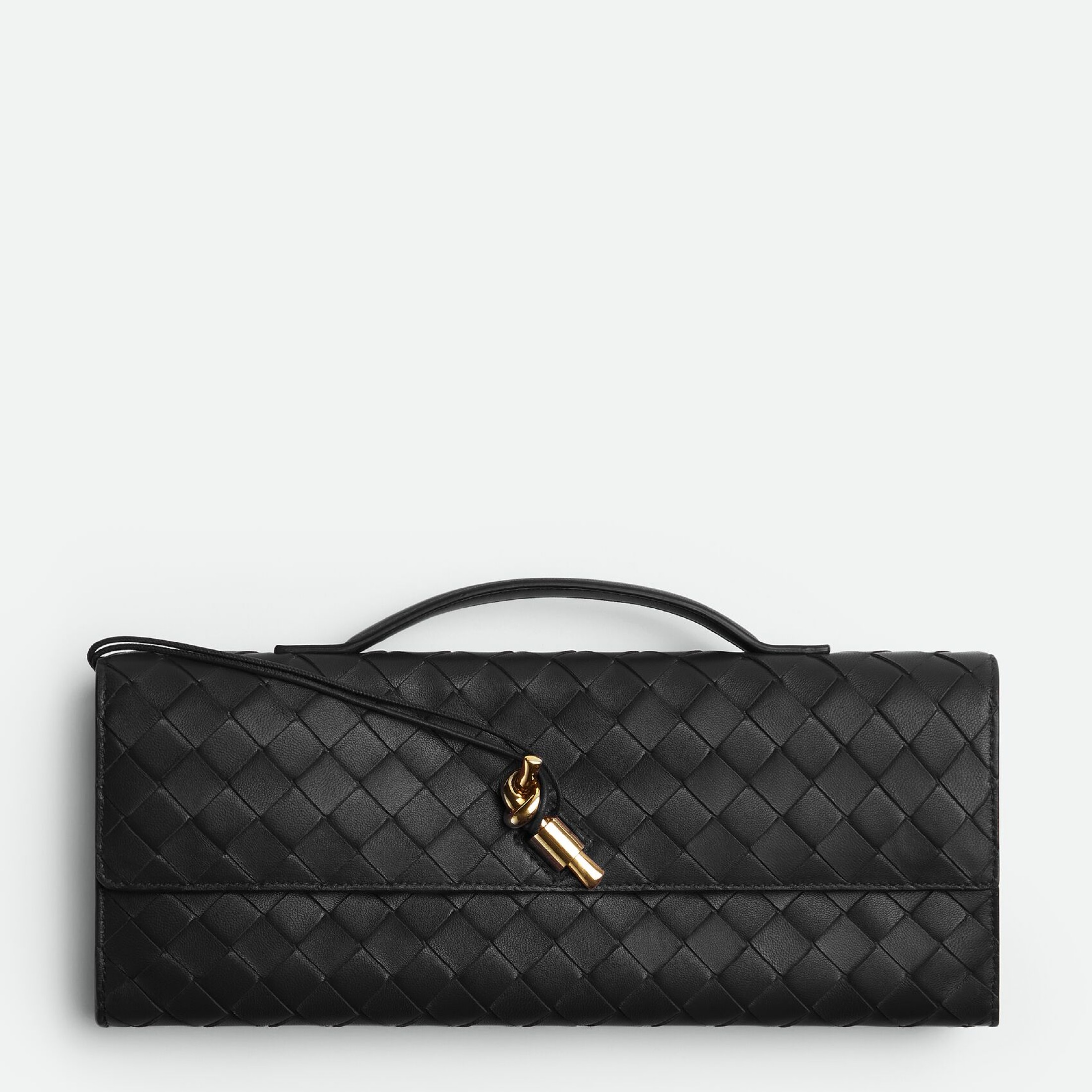 Top handle clutch in supple Intrecciato leather with signature knot closure. Signature bottega weave. Holds a surprisingly large amount of stuff