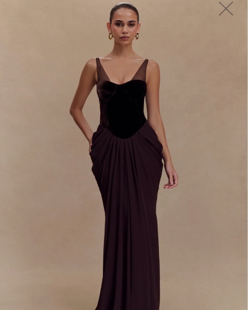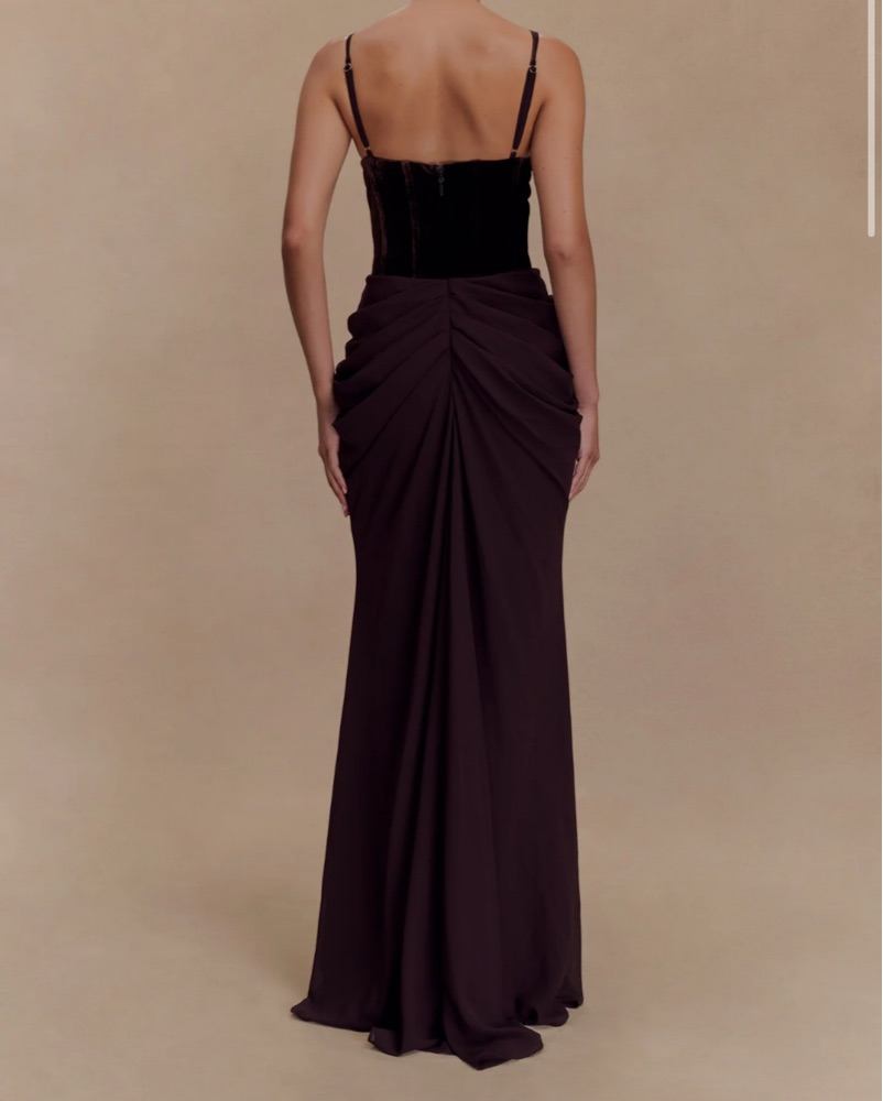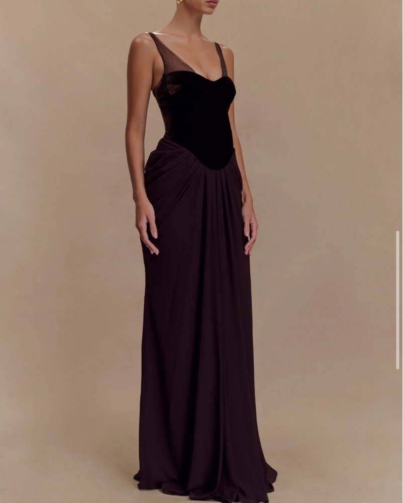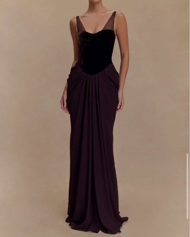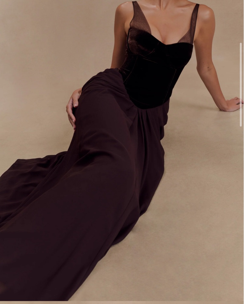 Cacao Brown - combines timeless elegance with modern sophistication. Featuring a stunning sweetheart neckline and a structured corset bodice, this dress is designed to accentuate your curves and create a flattering silhouette. The velvet fabric offers a luxurious and rich texture.