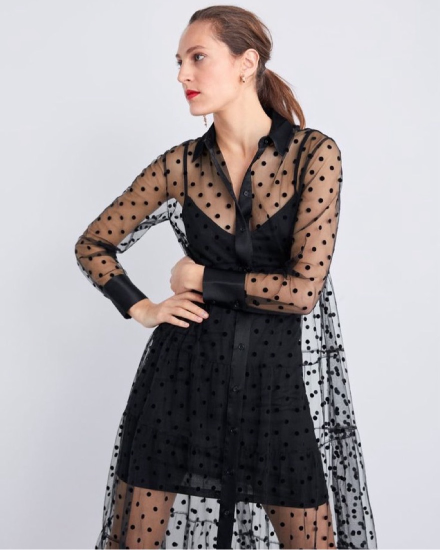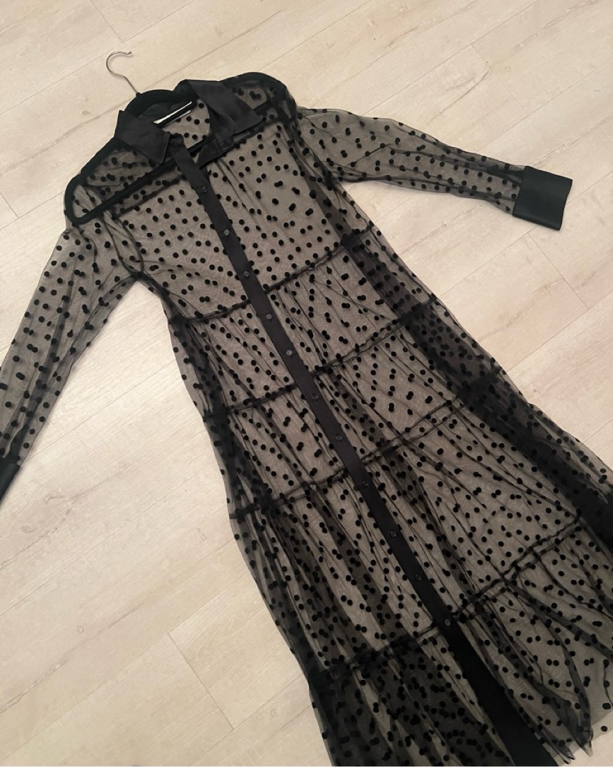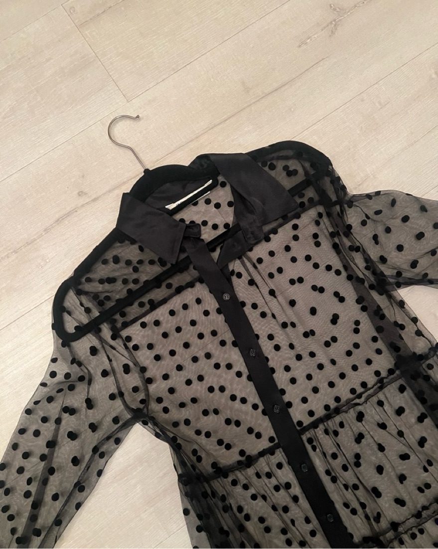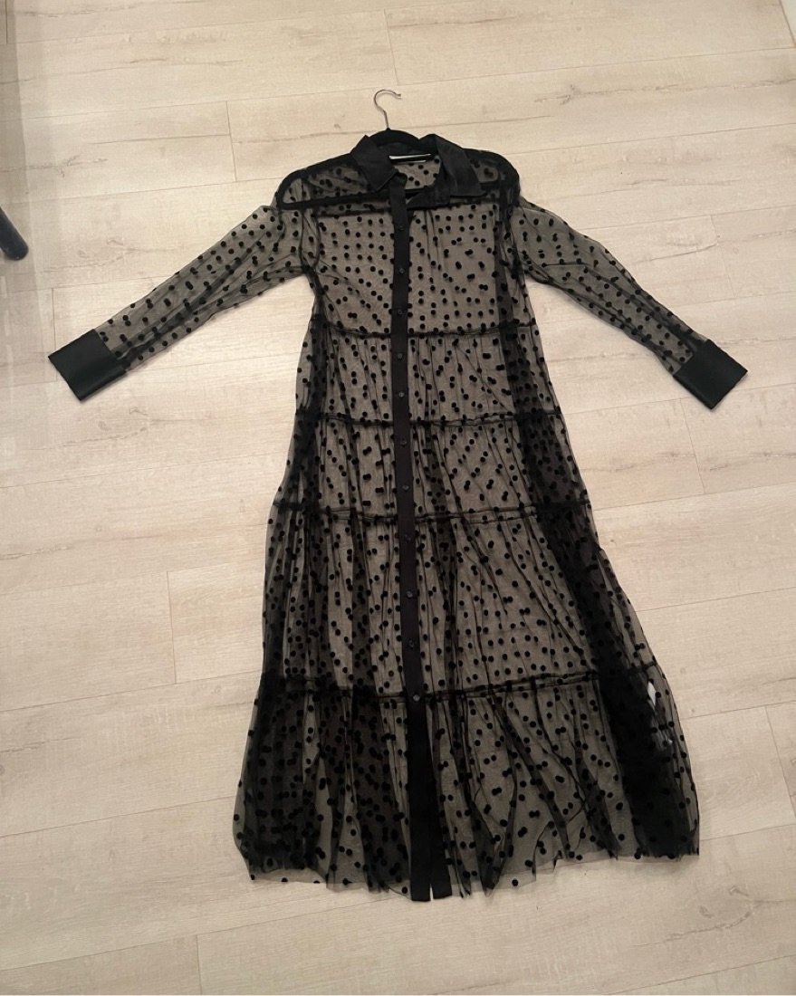 This stunning polka dot dress exudes elegance and sophistication. The sheer overlay creates a captivating, eye-catching look that would be perfect for a formal event or a night out on the town.