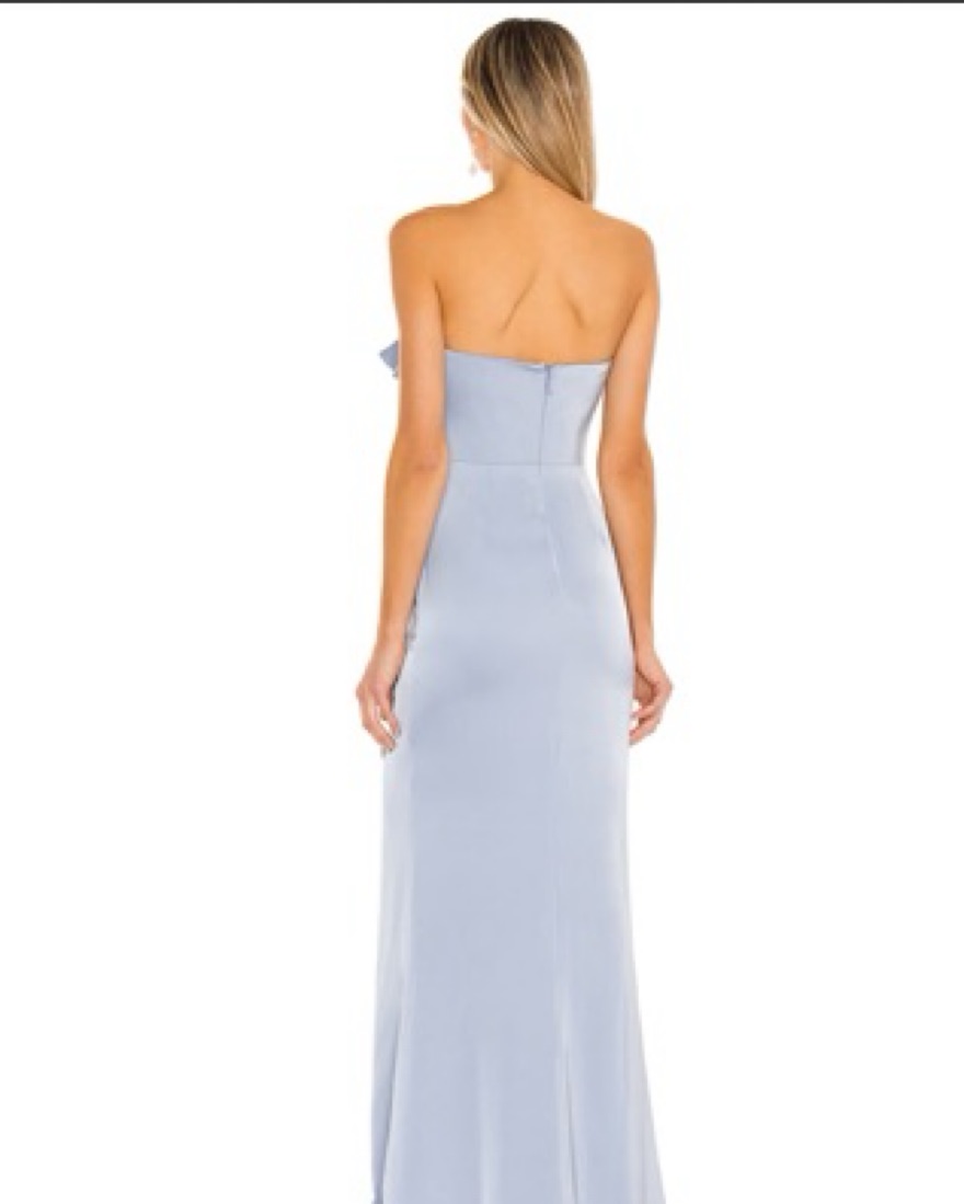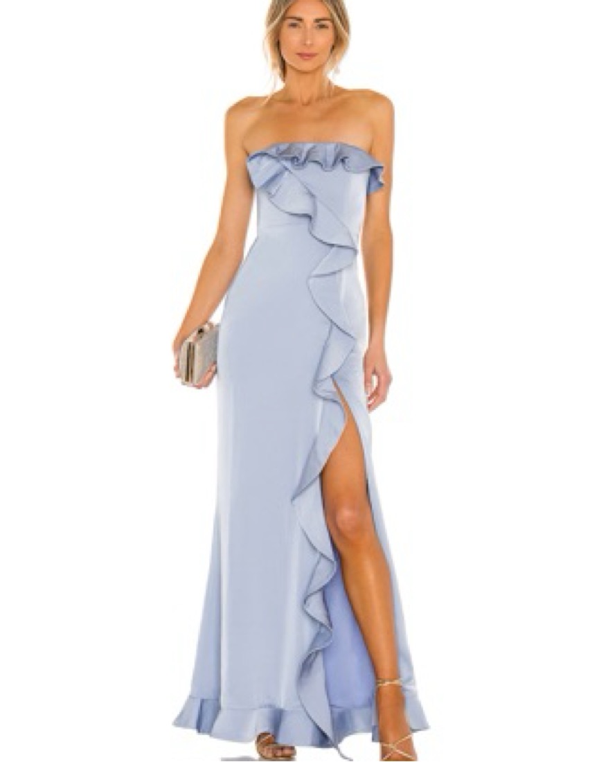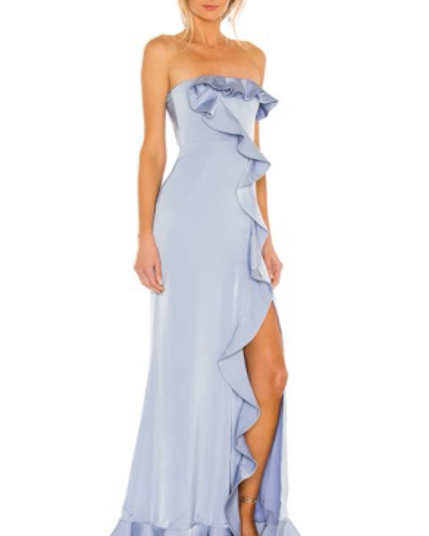 Baby blue silky gown with ruffle detailing.
