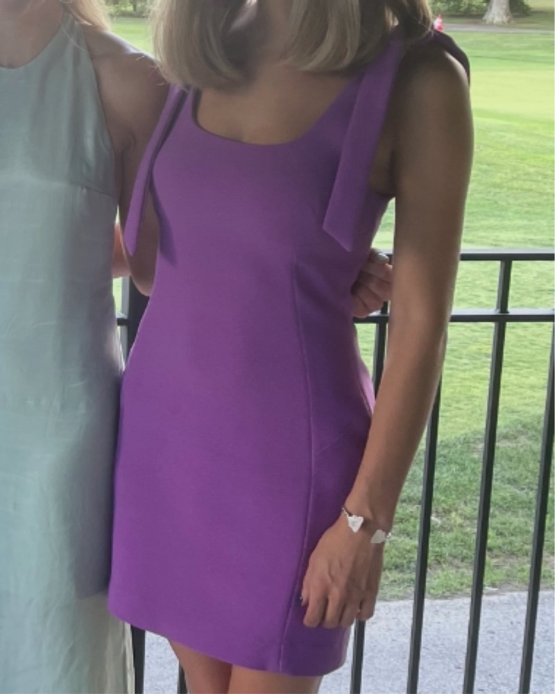This embellished crepe mini dress in fun and flirty. It features a scooped neckline on the front and back and an exposed zipper. Tie shoulders in a bow or knot the for a more modern look.