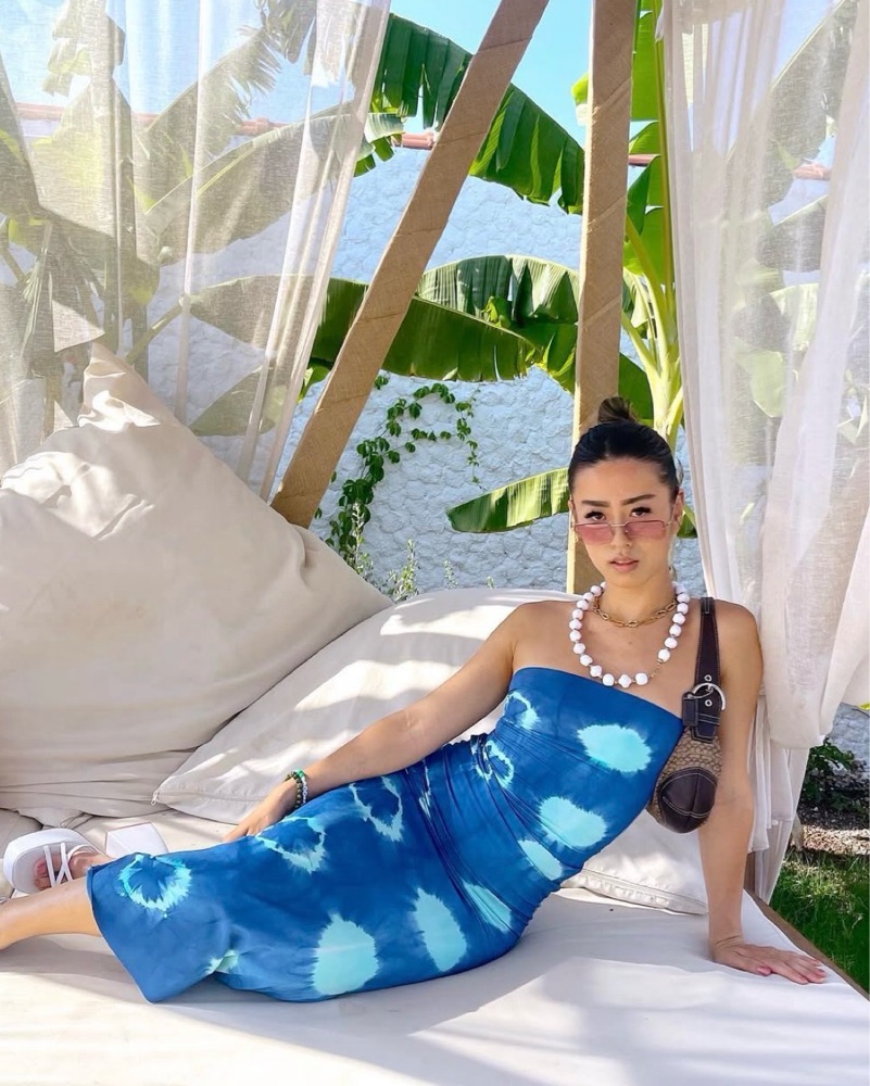 This vibrant tie-dye maxi dress is perfect for a tropical vacation or summer party. The flowing fabric and eye-catching pattern create a chic, bohemian look. Perfect for XS/S! I’m a size 2-4 for reference lol