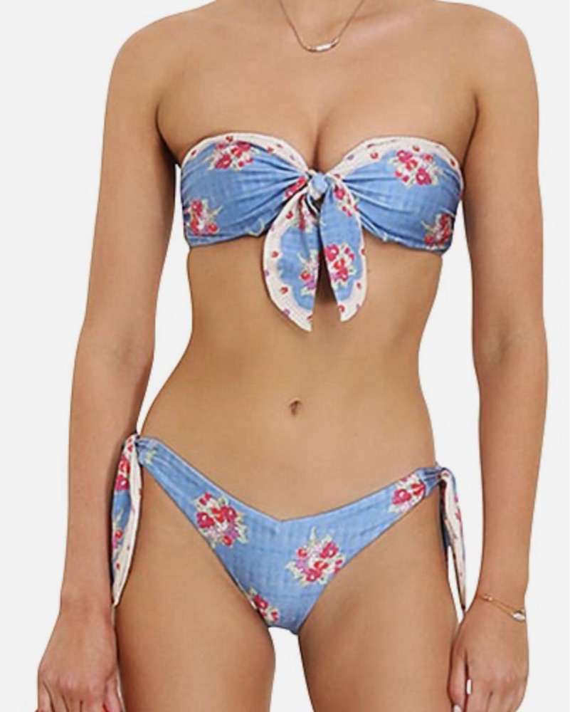The Clover Scarf Tie Bikini in Blue Painted Floral from the Zimmermann Resort Swim 2023 Collection. An Italian shiny lycra bandeau style Bikini featuring removable cups, straps and boning. Zimmermann size 1