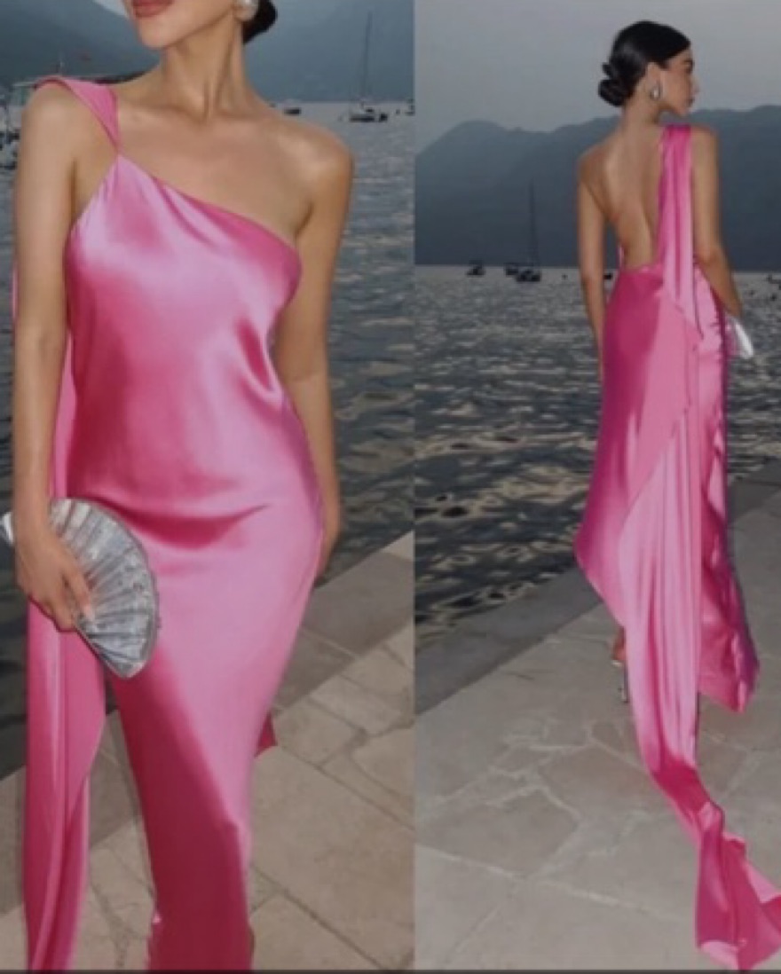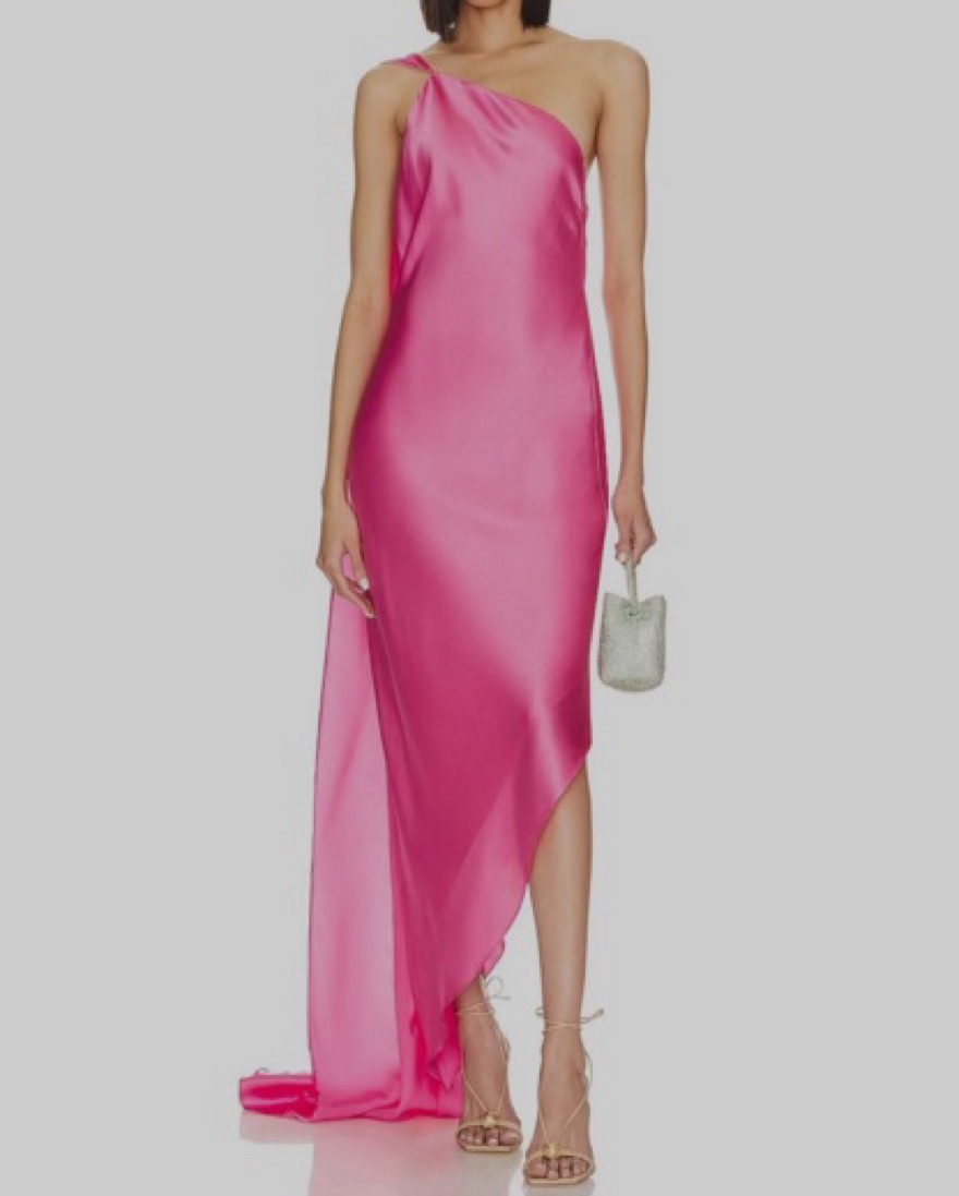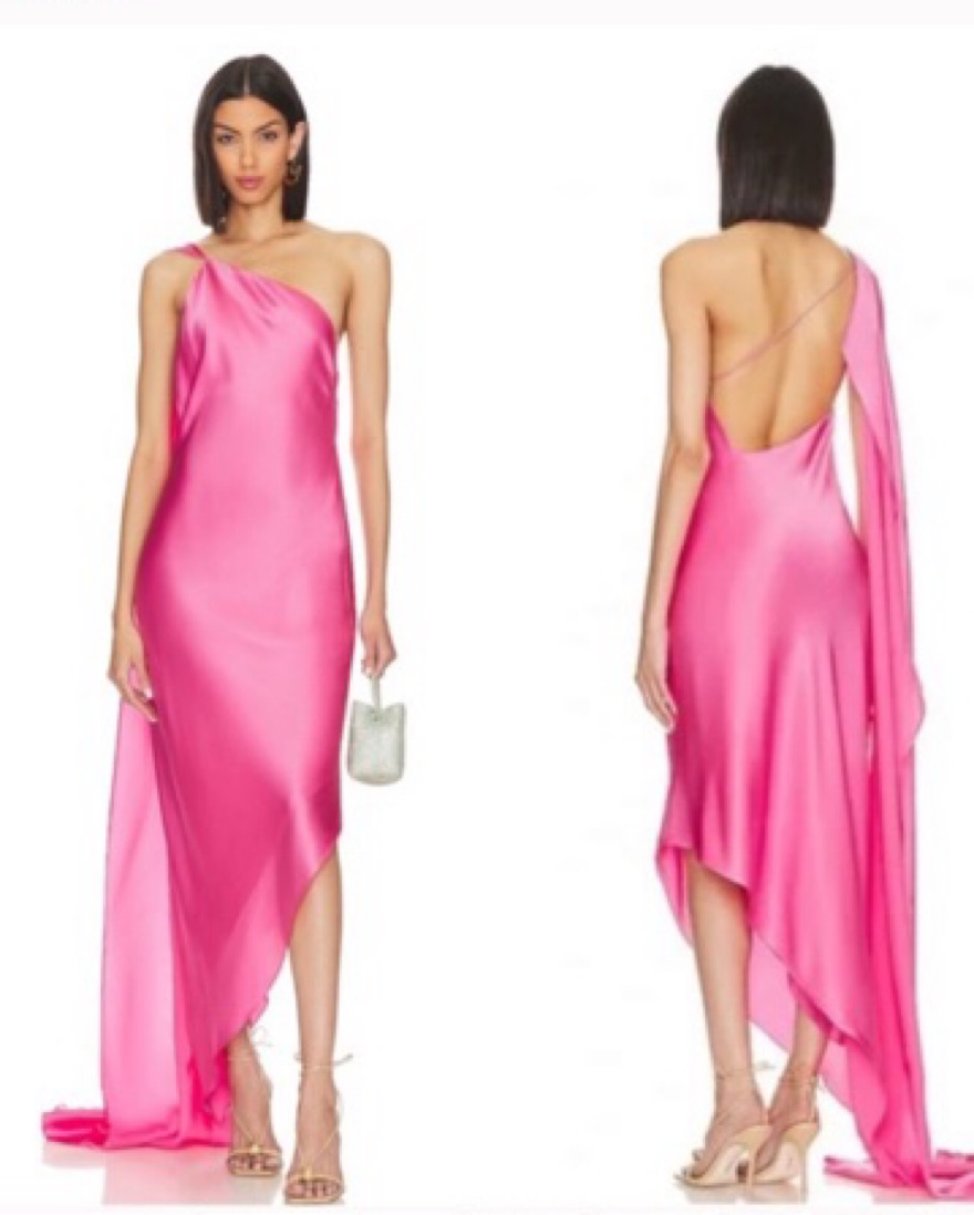 Never worn. rose-hued fine silk, this one-shoulder silhouette has an asymmetrical hem and an eye-catching scarf extending from the shoulder to a unique loop on your finger.