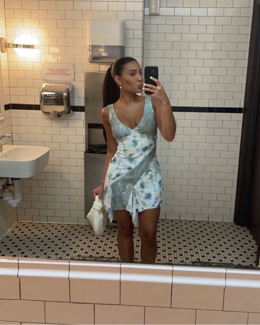 Mixed print mini dress. Fully lined, not sheer. Twisted shoulder straps.
