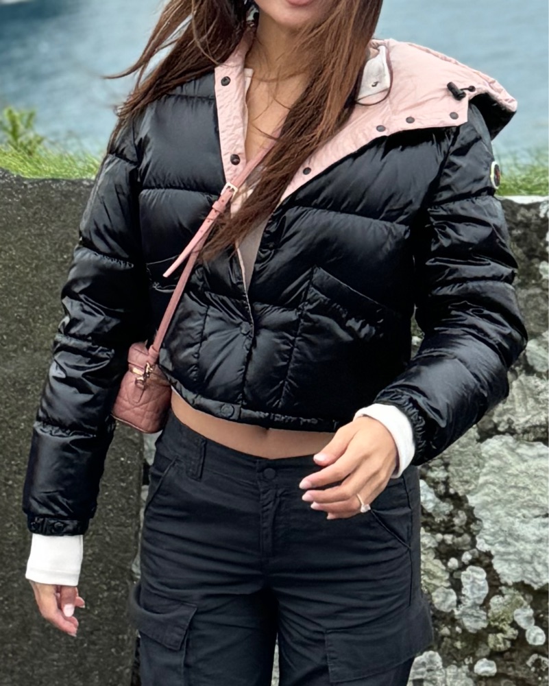 Black exterior, with a light pink interior. Down cropped jacket.