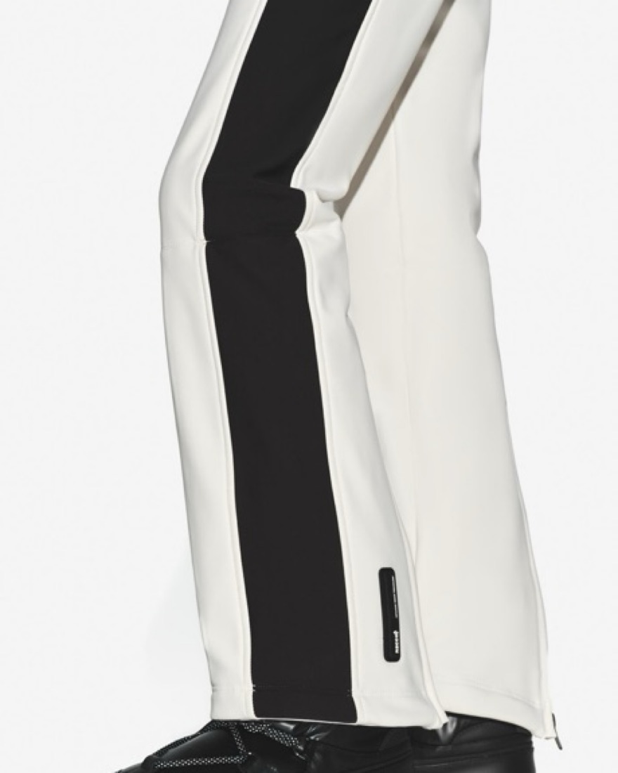 White ski pants with black stripes down the side. Comes with detachable elastic straps. Water and wind resistant. Super cute, comfortable, and functional for the slopes!