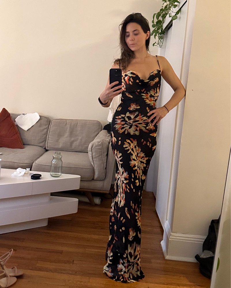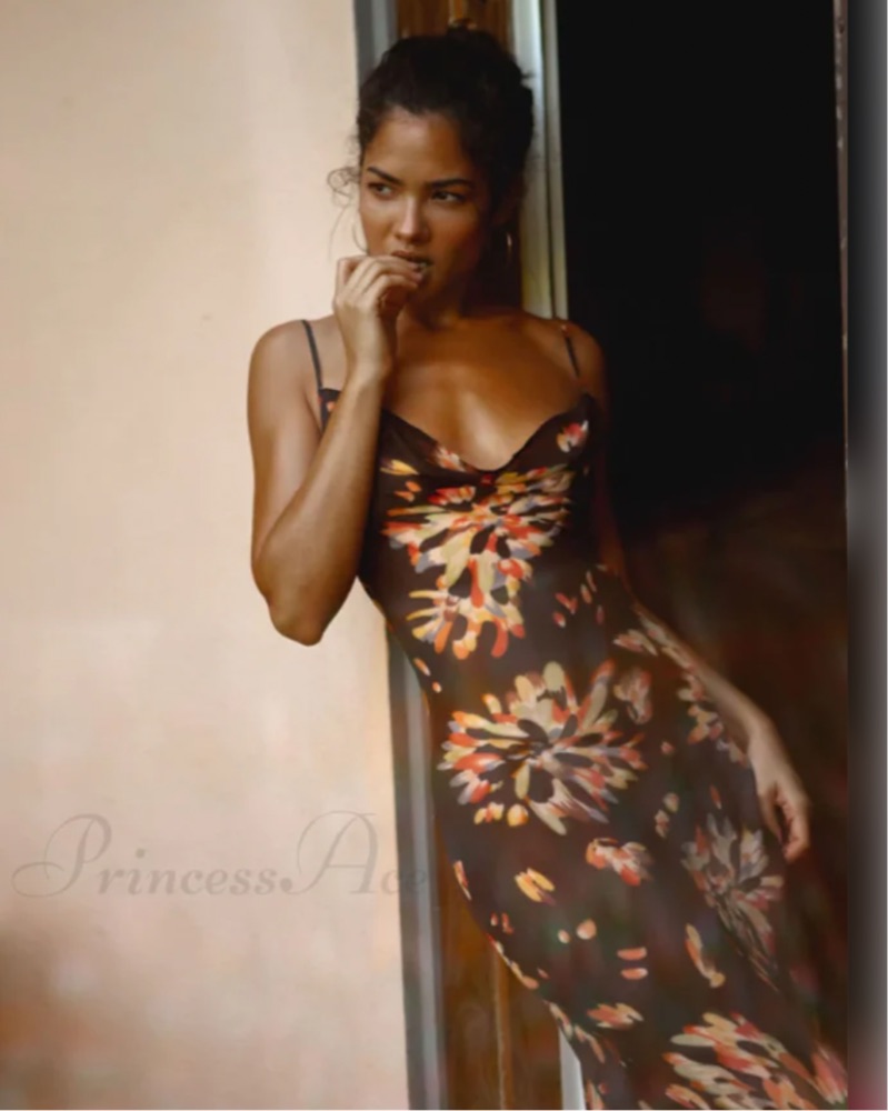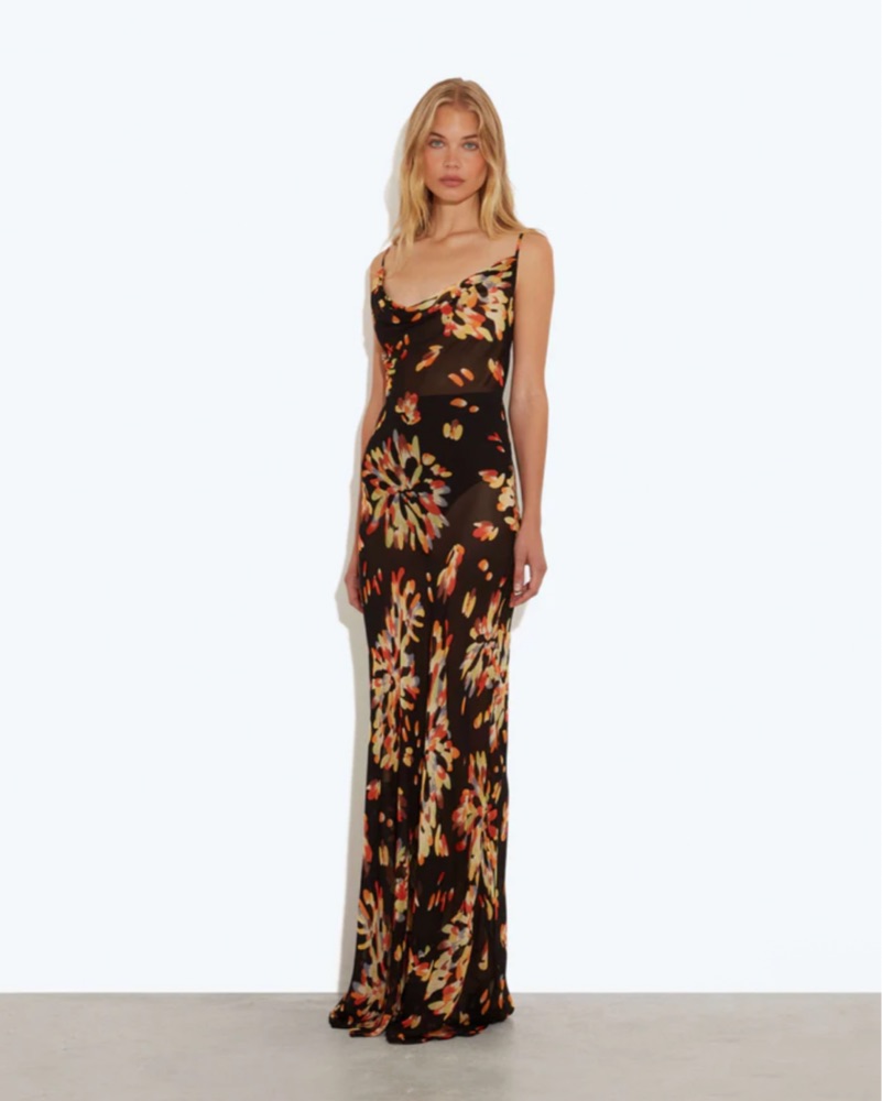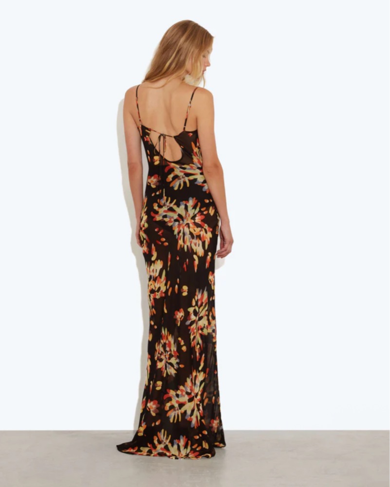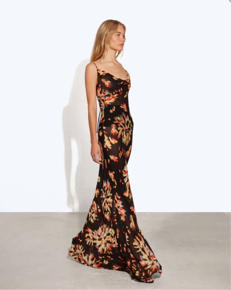 The Caterina dress is chic, sexy, floor-sweeping slip dress in an exploded floral print.