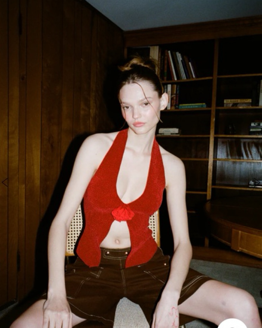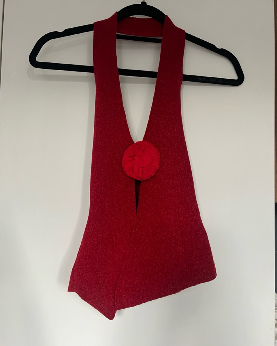 The Rose Top is a halter neck style top with an open front design featuring a self fabricated flower at the bust.