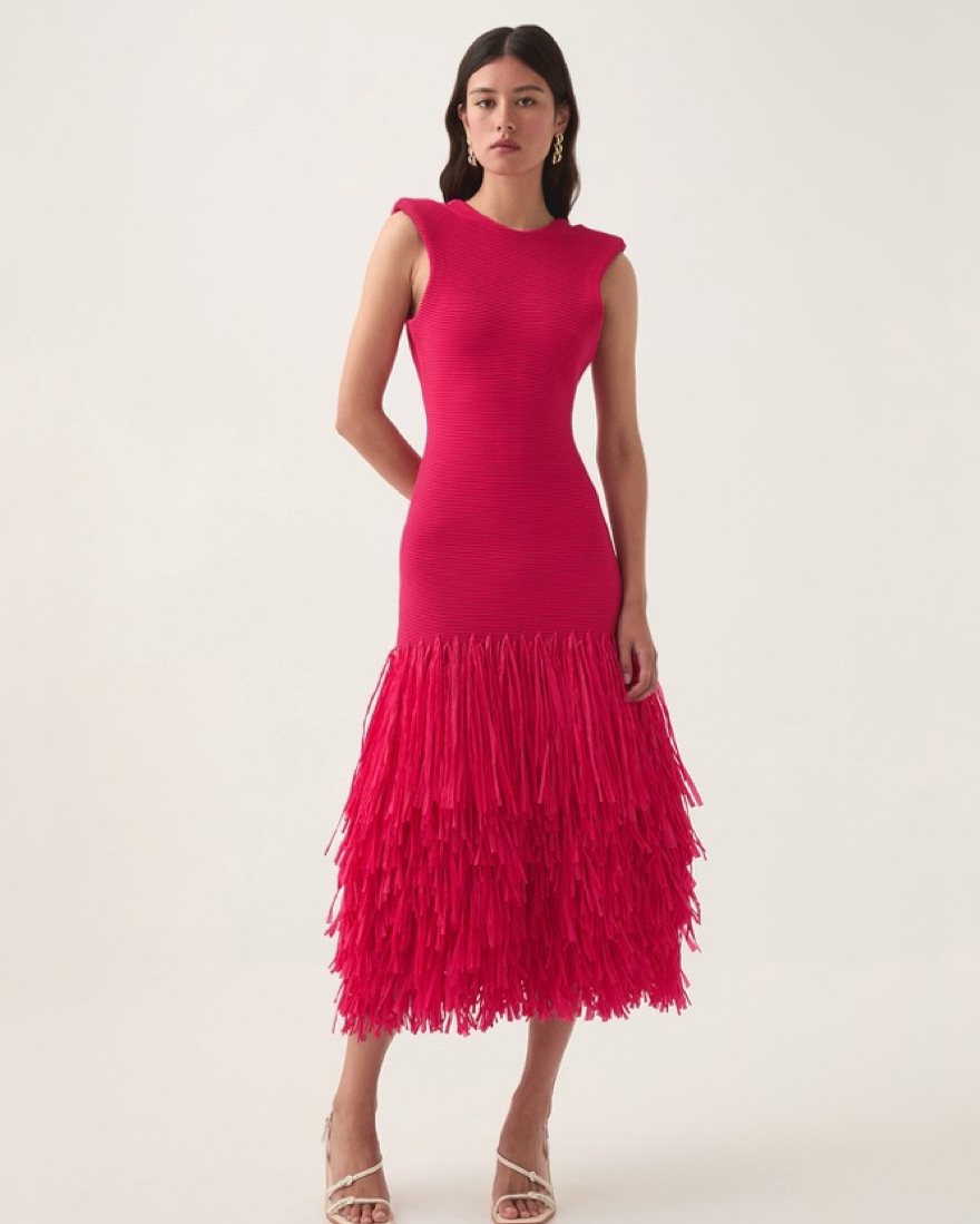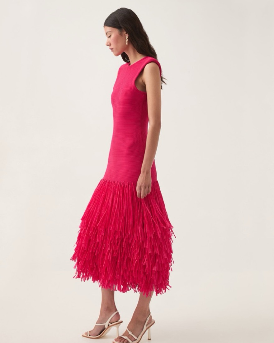 This bold fuschia midi dress features a striking textured fringe design that adds a touch of fun and elegance to your look. Perfect for a night out or special event.