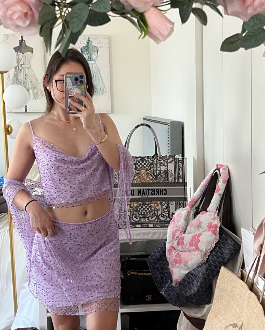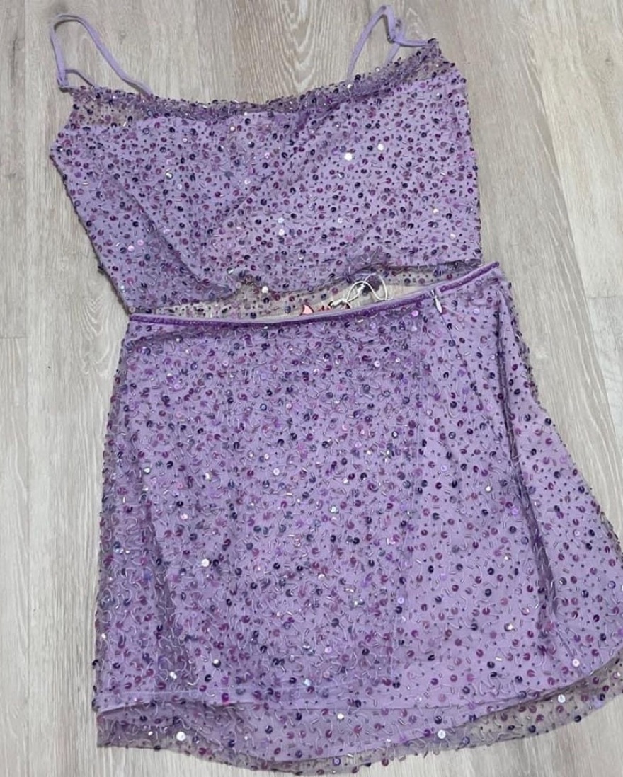 XS but should fit S as well. Gorgeous lavender sequin beaded crop top mini skirt and shawl set. **Custom made to add lining so it isn’t sheer like the brand pics, but i may try taking lining out.