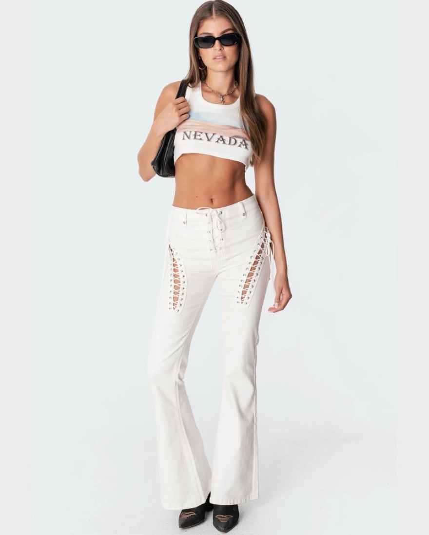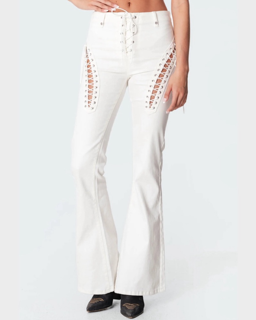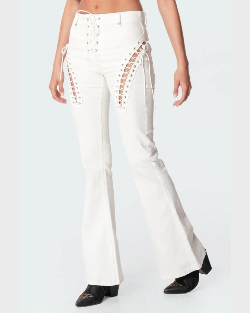These chic white flare pants feature a lace-up design for a stylish flair. Perfect for a night out or a festival-inspired look.