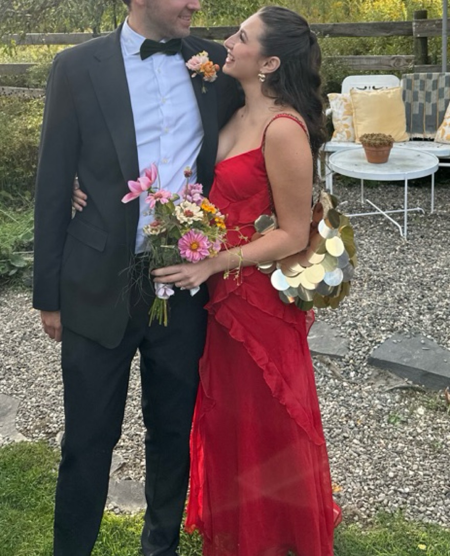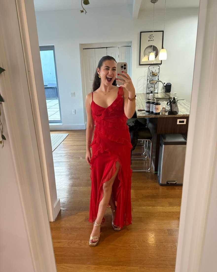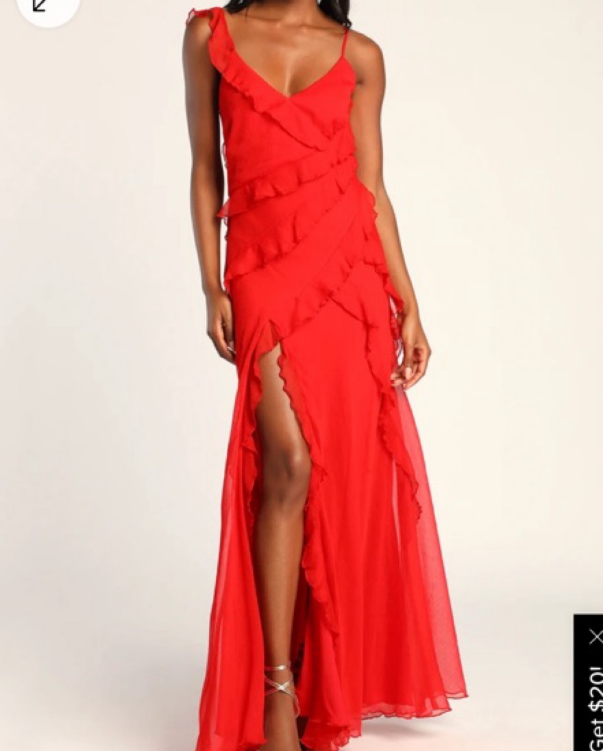 Super beautiful and fun red ruffled dress with an open back! Amazing wedding guest dress.