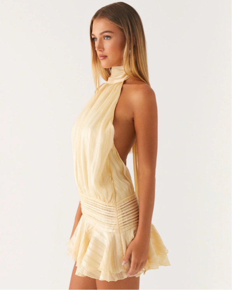 Willow chiffon mini dress in yellow from Peppermayo. Perfect for the summer day and can’t be dressed up or down for both day time and night time! The flouncy skirt and open back design create a flirty and feminine look