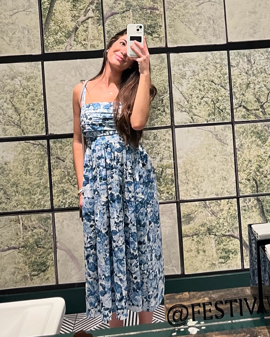 XS P! Emerson Poplin Wide Strap Midi Dtess in white and blue floral. Perfect condition. Thick material, so comfortable. Has pockets!!